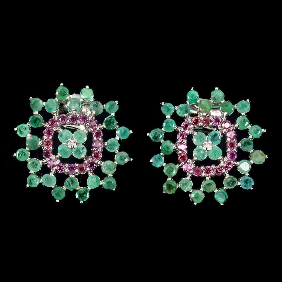 925 STERLING SILVER;PLATE-14K WHITE GOLD;MAIN STONE-EMERALD;OTHER GEMS-RHODOLITE GARNET;TOTAL WEIGHT-4.08 GRAM (TOTAL WEIGHT OF SILVER + STONE);DIMENSION-* STONE 1.5 TO 2.0 MM.* FACE EARRINGS 19.0 X 19.0 MM.;MAIN STONE SHAPE-ROUND; MAIN STONE COLOR-GREEN;TREATMENT-UNHEATED;ORIGIN-COLOMBIA;HARDNESS-7;