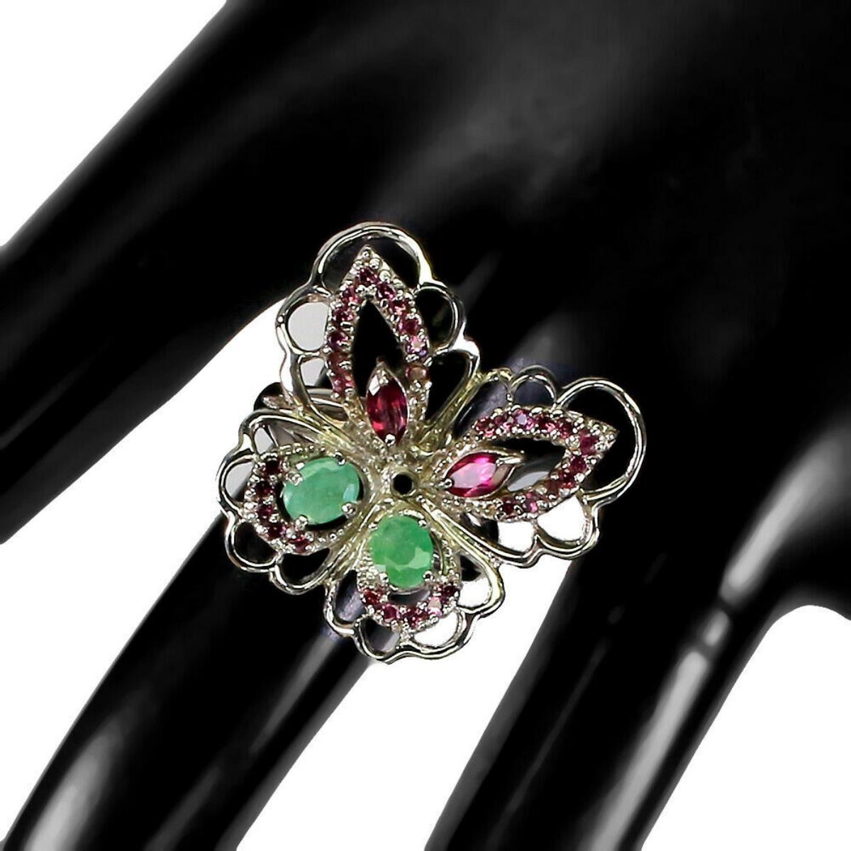 925 STERLING SILVER;PLATE-14K WHITE GOLD;RING SIZE/resizeable-7;MAIN STONE-EMERALD;OTHER GEMS-RHODOLITE GARNET;TOTAL WEIGHT-5.74 GRAM (TOTAL WEIGHT OF SILVER + STONE)DIMENSION-* STONE 1.0 TO 6.0 X 3.0 MM.* RING SIZE -7.0;* FACE RING- 25.0 X 23.0 MM.;MAIN STONE SHAPE-OVAL CUT;MAIN STONE COLOR- GREEN;TREATMENT-UNHEATED;HARDNESS-7.5 - 8.0;
