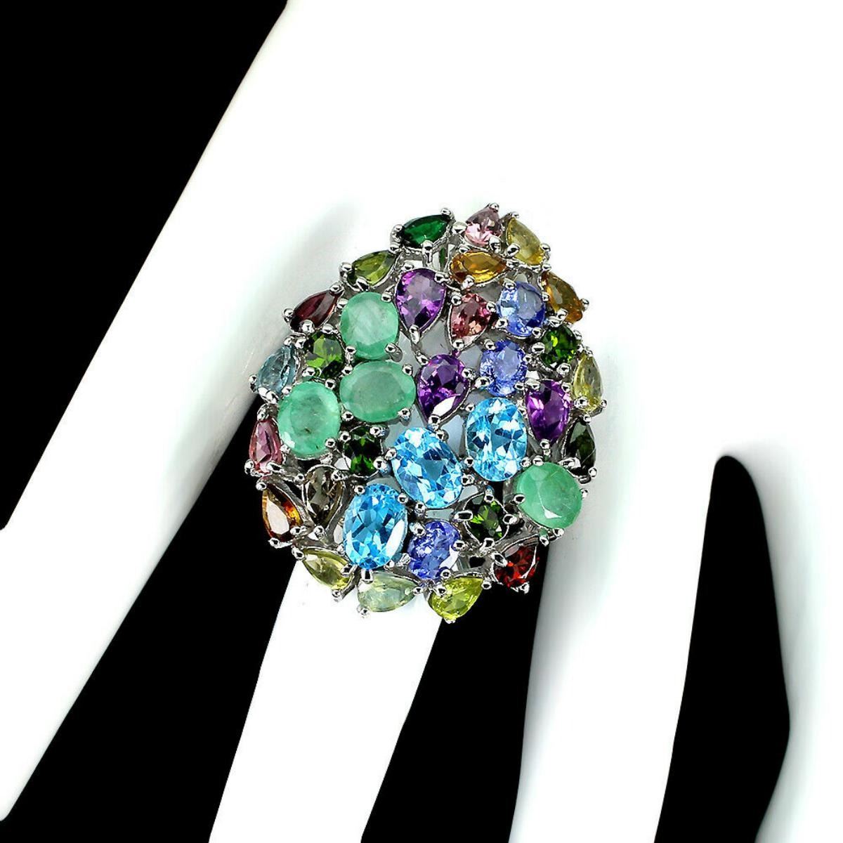 925 STERLING SILVER;PLATE-14K WHITE GOLD;RING SIZE (INCHES)-9(RESIZABLE);MAIN STONE-SWISS BLUE TOPAZ;OTHER GEMS-AMETHYST, CHROME DIOPSIDE, EMERALD, TANZANITE, TOURMALINE;TOTAL WEIGHT-13.88 GRAM (TOTAL WEIGHT OF SILVER + STONE);DIMENSION-* STONE 4.0 X 2.0 TO 7.0 X 5.0 MM. * RING SIZE 9.0 * FACE RING 38.0 X 30.0 MM.;MAIN STONE SHAPE-OVAL; MAIN STONE COLOR- SWISS BLUE;CLARITY/GRADE-IF;TREATMENT-HEATED;ORIGIN-AFRICA;HARDNESS-8;
