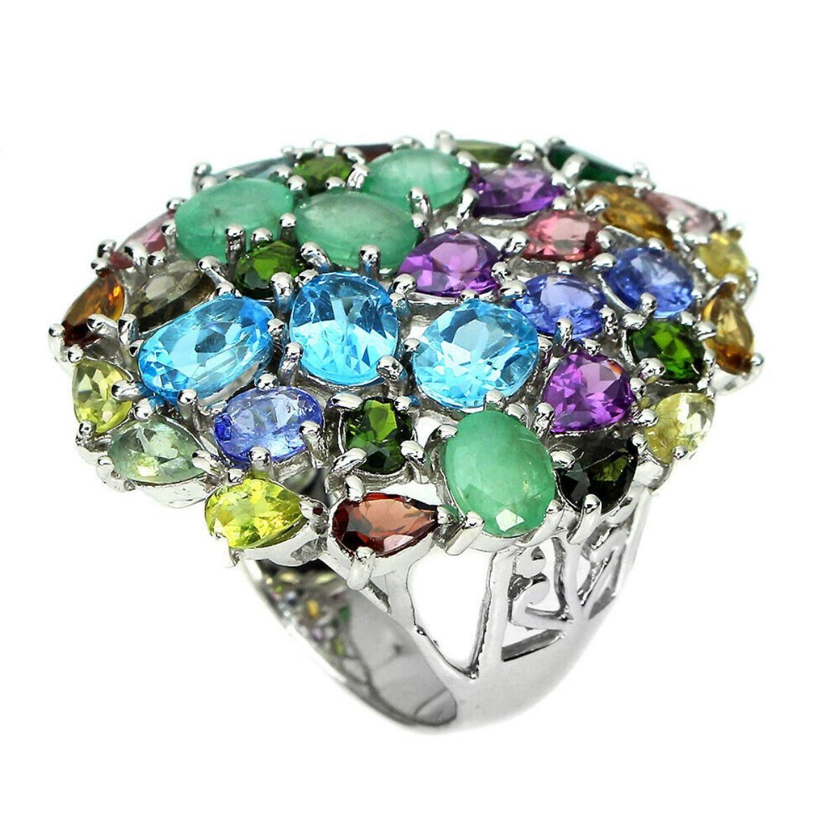 925 STERLING SILVER;PLATE-14K WHITE GOLD;RING SIZE (INCHES)-9(RESIZABLE);MAIN STONE-SWISS BLUE TOPAZ;OTHER GEMS-AMETHYST, CHROME DIOPSIDE, EMERALD, TANZANITE, TOURMALINE;TOTAL WEIGHT-13.88 GRAM (TOTAL WEIGHT OF SILVER + STONE);DIMENSION-* STONE 4.0 X 2.0 TO 7.0 X 5.0 MM. * RING SIZE 9.0 * FACE RING 38.0 X 30.0 MM.;MAIN STONE SHAPE-OVAL; MAIN STONE COLOR- SWISS BLUE;CLARITY/GRADE-IF;TREATMENT-HEATED;ORIGIN-AFRICA;HARDNESS-8;