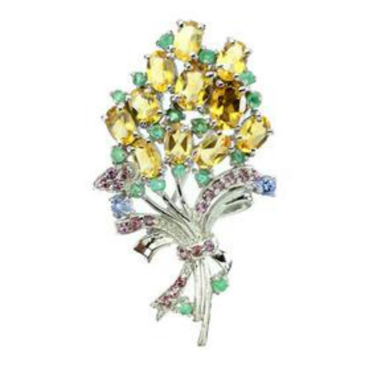 925 STERLING SILVER;PLATE-2-TONE WHITE & YELLOW 14K GOLD;MAIN STONE-CITRINE;OTHER GEMS-EMERALD, RHODOLITE GARNET, TANZANITE;TOTAL WEIGHT-9.32 GRAM (TOTAL WEIGHT OF SILVER + STONE)DIMENSION-* STONE 1.5 TO 7.0 X 5.0 MM.;* FACE BROOCH- 47.0 X 27.0 MM.;MAIN STONE SHAPE-OVAL CUT;MAIN STONE COLOR- YELLOW;CLARITY/GRADE-IF TO VVS;TREATMENT-UNHEATED;HARDNESS-7;