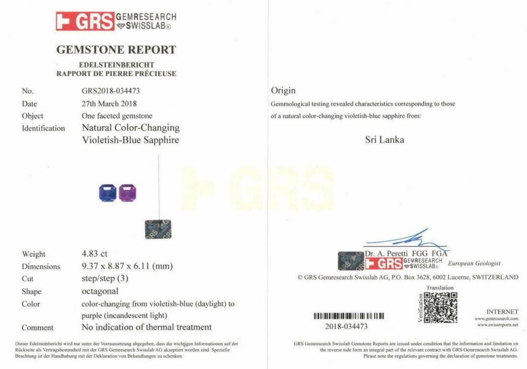 Natural Color Changing Sapphire 4.83 Cts ......Completely eye clean....completely untreated....Certified by GRS Swiss lab