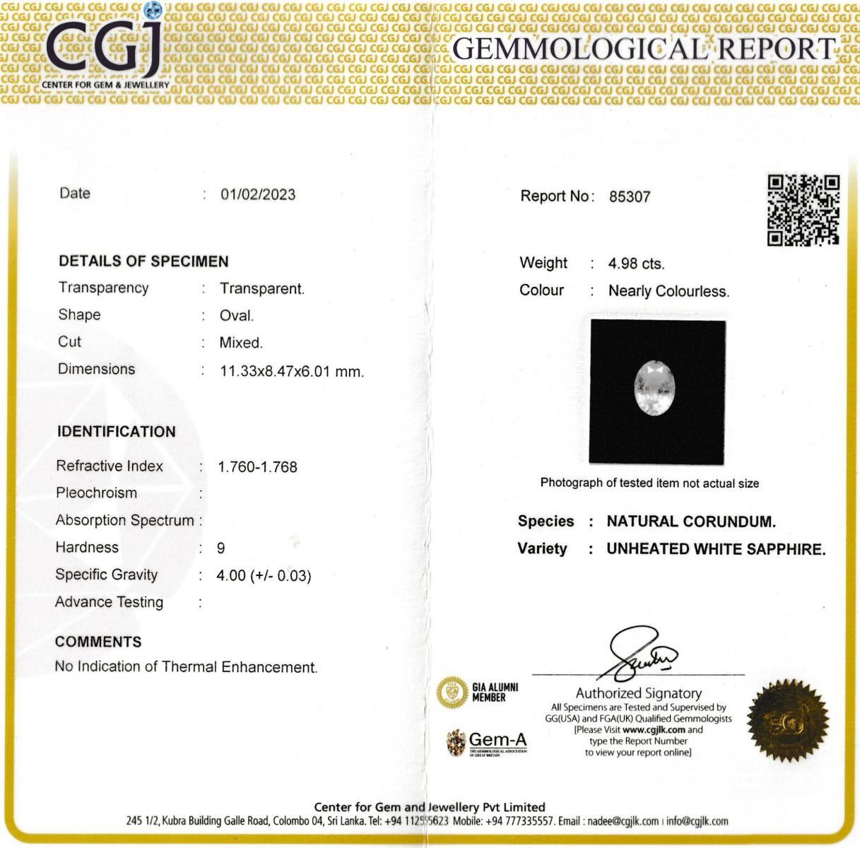 Natural Colorless White Sapphire 4.98 Cts; Oval Shape; Size 11.33 x 8.47 x 6.01 MM; VVS clarity; Completely Untreated ; Origin - Sri Lanka;