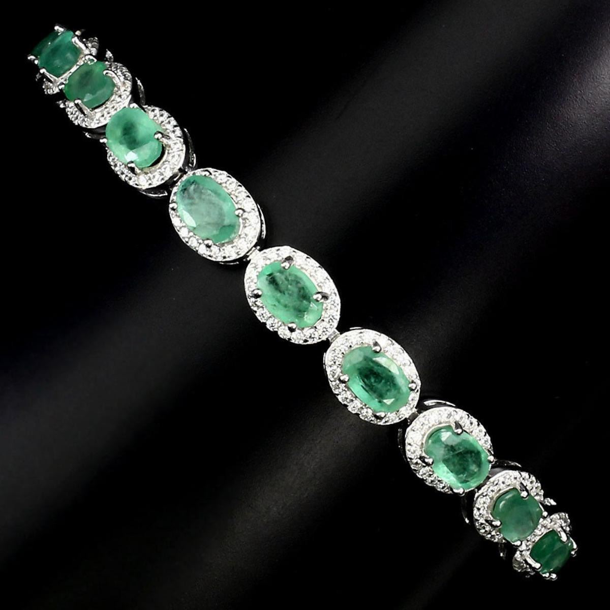 925 STERLING SILVER;PLATE14K WHITE GOLD;LENGTH (INCHES)7.5;MAIN STONE EMERALD;OTHER GEMSCUBIC ZIRCONIA;TOTAL WEIGHT59.98 CT (TOTAL WEIGHT OF SILVER + STONE)DIMENSION* STONE 6.0 X 4.0 MM. * CZ 1.0 MM. * FACE BRACELET 168.0 X 6.0 MM.MAIN STONE SHAPEOVAL CUT;MAIN STONE COLORTOP RICH GREEN;CLARITY/GRADE TRANSPARENT;LUSTER PRECIOUS;TREATMENT UNHEATED;ORIGIN Columbia;HARDNESS 7.5 - 8.0;