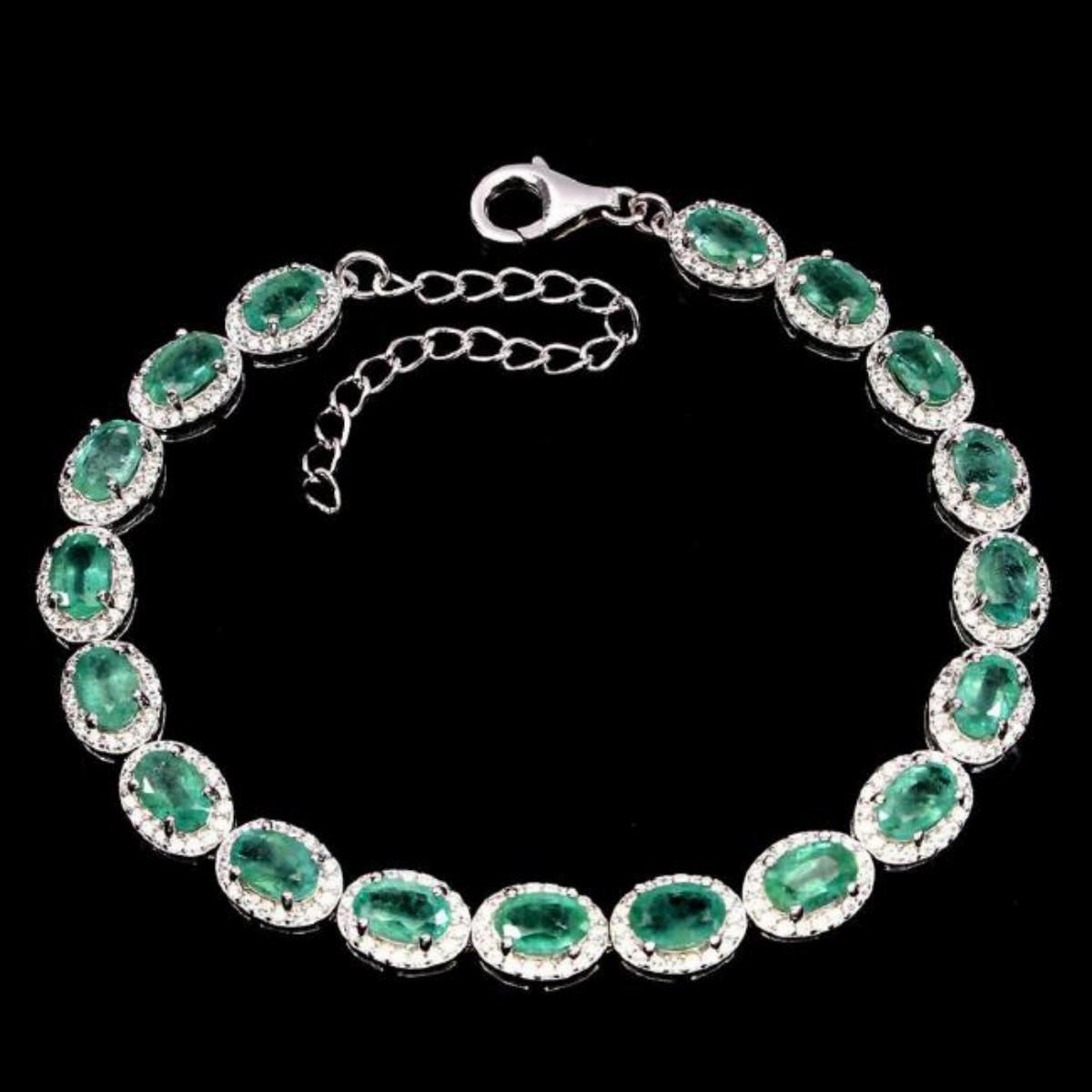 925 STERLING SILVER; PLATE 14K WHITE GOLD; LENGTH (INCHES) 9.5; MAIN STONE EMERALD; OTHER GEMS CUBIC ZIRCONIA; TOTAL WEIGHT 55.41 CT (TOTAL WEIGHT OF SILVER + STONE) DIMENSION * STONE 6.0 X 4.0 MM. * CZ 1.0 MM. * FACE BRACELET 155.0 X 6.0 MM. MAIN STONE SHAPE OVAL CUT MAIN STONE COLOR TOP RICH GREEN CLARITY/GRADE TRANSPARENT LUSTER MESMERIZING...Origin - Columbia