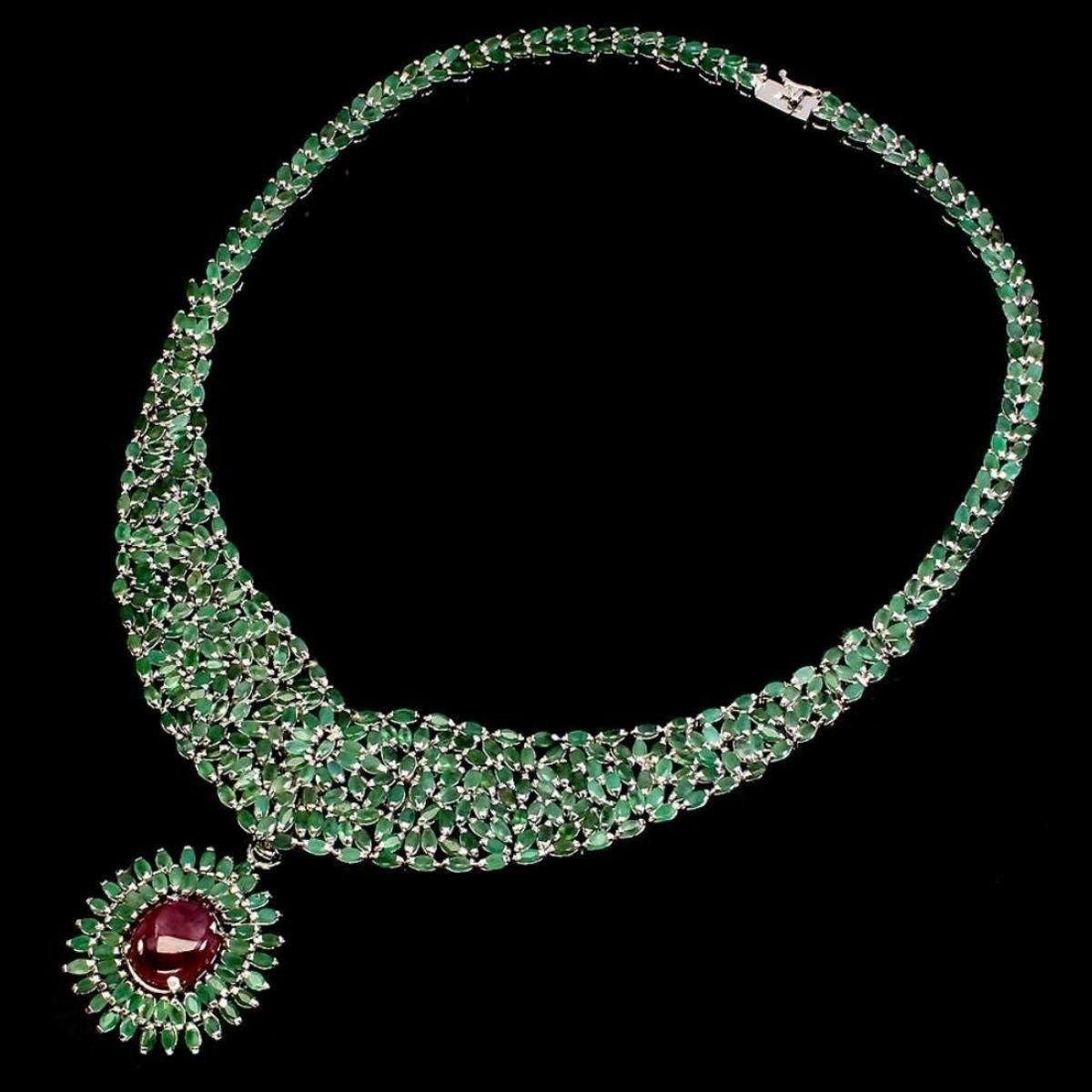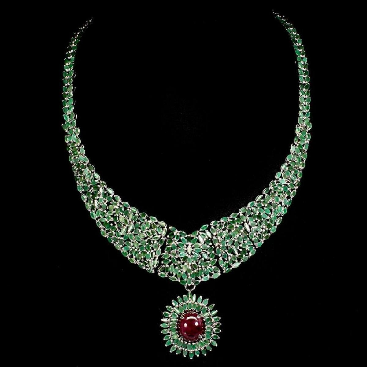 925 STERLING SILVER;PLATE.....14K WHITE GOLD;;LENGTH (INCHES)17.5 MAIN STONE RUBY OTHER GEMS EMERALD TOTAL WEIGHT 418.28 CT (TOTAL WEIGHT OF SILVER + STONE)DIMENSION* STONE 4.0 X 2.0 TO 13.0 X 11.0 MM. * STONES PART LENGTH 430.0 X 61.0 MM.MAIN STONE SHAPE OVAL CABOCHON MAIN STONE COLOR TOP RICH RED CLARITY/GRADE TRANSPARENT LUSTER PRECIOUS TREATMENT HEATED/unheated Ruby ORIGIN AFRICA & Emerald Origin Columbia HARDNESS 9.0