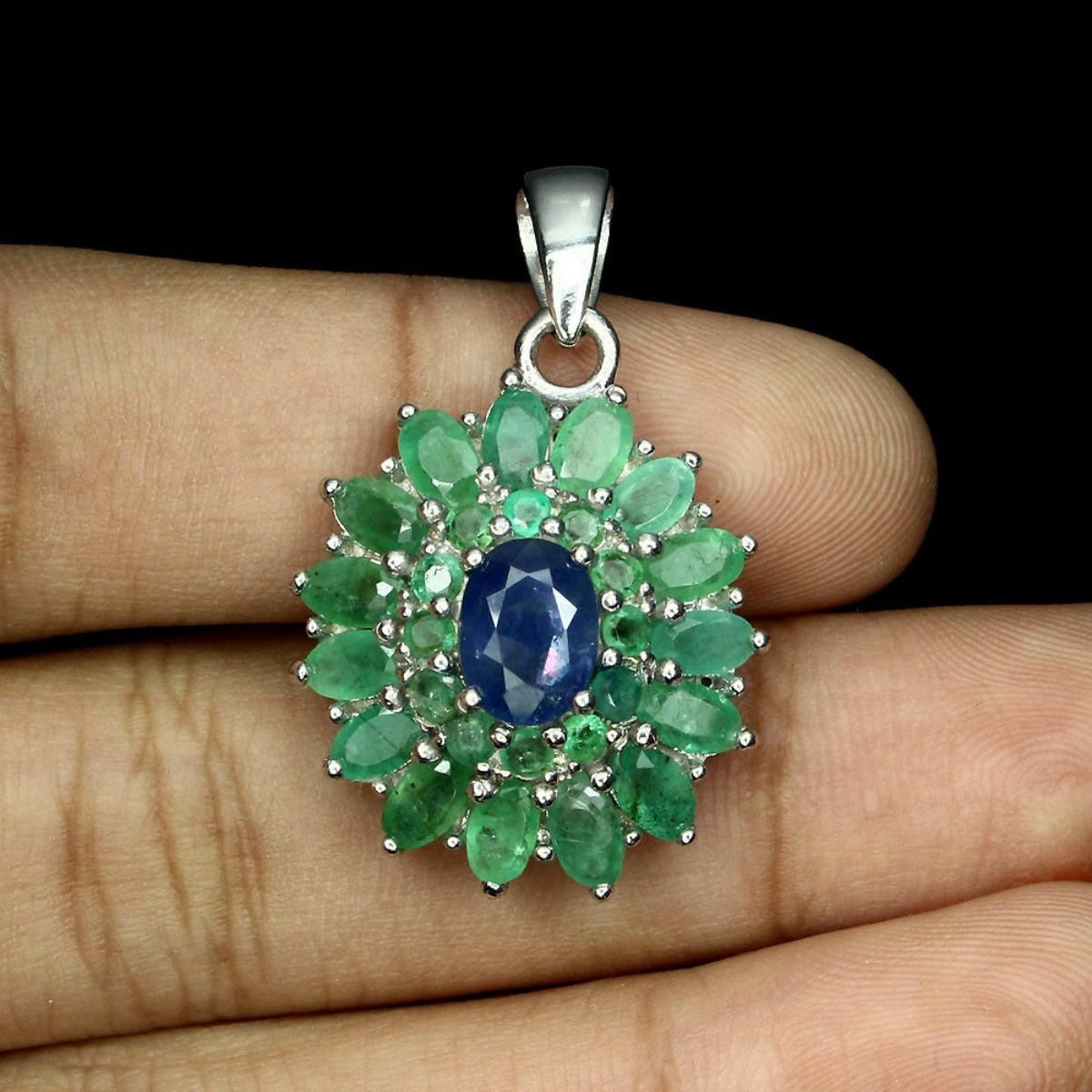 925 STERLING SILVER;PLATE...14K WHITE GOLD;MAIN STONE-SAPPHIRE;OTHER GEMS-EMERALD;TOTAL WEIGHT30.26 CT (TOTAL WEIGHT OF SILVER + STONE)DIMENSION* STONE 2.0 TO 8.0 X 6.0 MM. * FACE PENDANT 34.0 X 22.0 MM.MAIN STONE SHAPEOVAL CUT;sapphire COLORTOP RICH BLUE;CLARITY/GRADETRANSPARENT;HARDNESS9.0