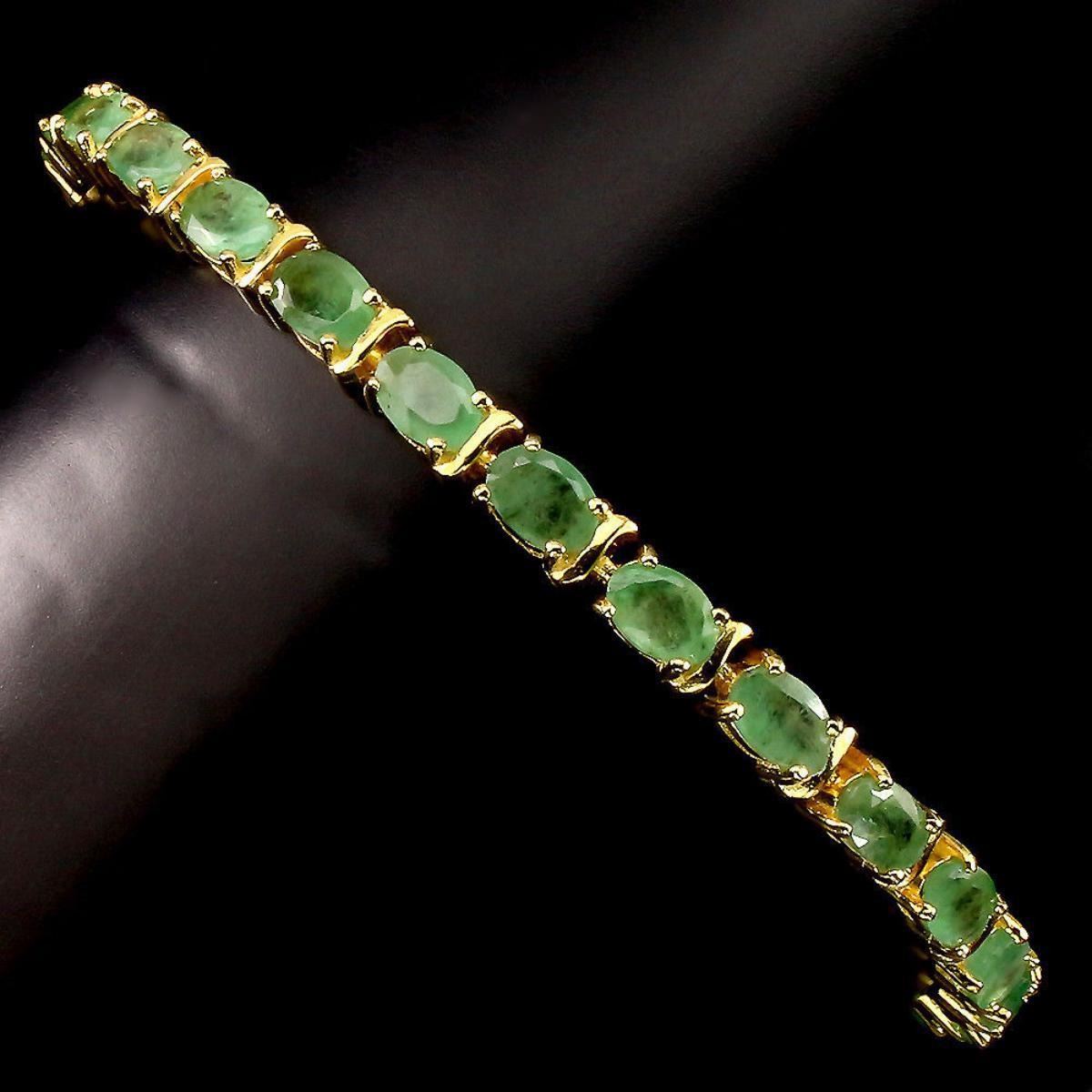 925 STERLING SILVER;PLATE 14K YELLOW GOLD;.....LENGTH (INCHES)7.5; MAIN STONE EMERALD OTHER GEMS CUBIC ZIRCONIA TOTAL WEIGHT 61.35 CT (TOTAL WEIGHT OF SILVER + STONE)DIMENSION* STONE 6.0 X 4.0 MM. * CZ 2.0 MM. * FACE BRACELET 175.0 X 5.0 MM.MAIN STONE SHAPEOVAL CUT MAIN STONE COLORTOP RICH GREEN CLARITY/GRADE TRANSPARENT LUSTER PRECIOUS TREATMENT UNHEATED ORIGIN Colombia; HARDNESS 7.5 - 8.0