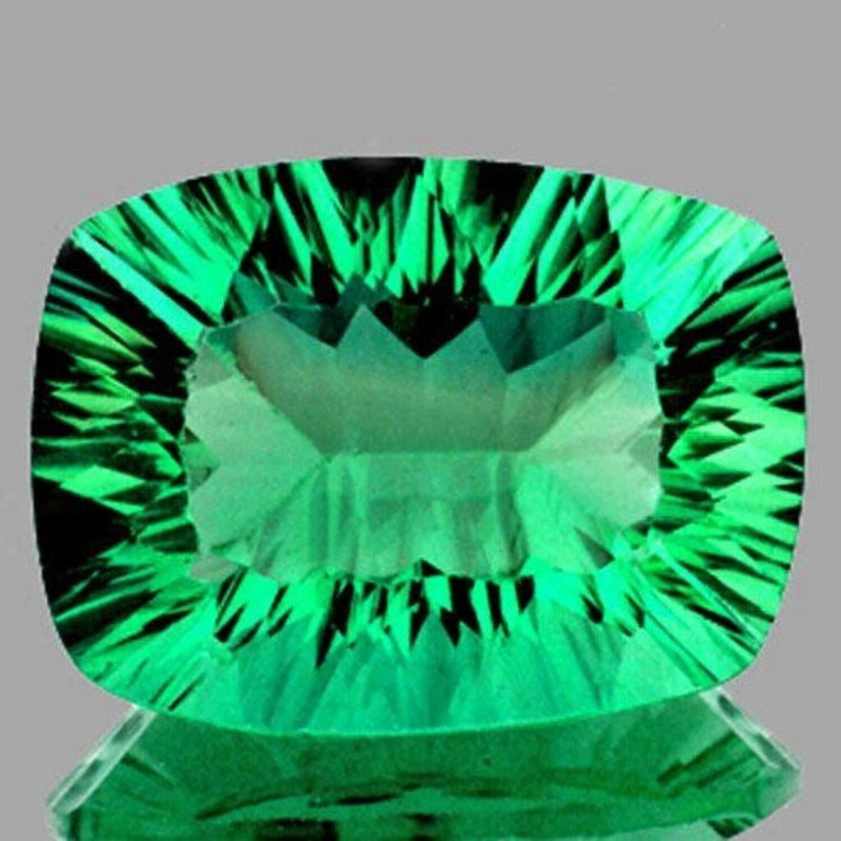 Natural Fluorite WEIGHT : 24.08 cts; SHAPE : Rectangle (Concave Cut) SIZE ( L x W x D ) : 19.57 x 15.08 x 11.01 mm; QUANTITY : 1 piece; COLOR : Emerald Green AAA COLOR; CLARITY : Flawless-VVS1 AAA Grade; ORIGIN : USA; HARDNESS : 4-5; LUSTER : Excellent!!! TREATMENT : 100% Natural Unheated;