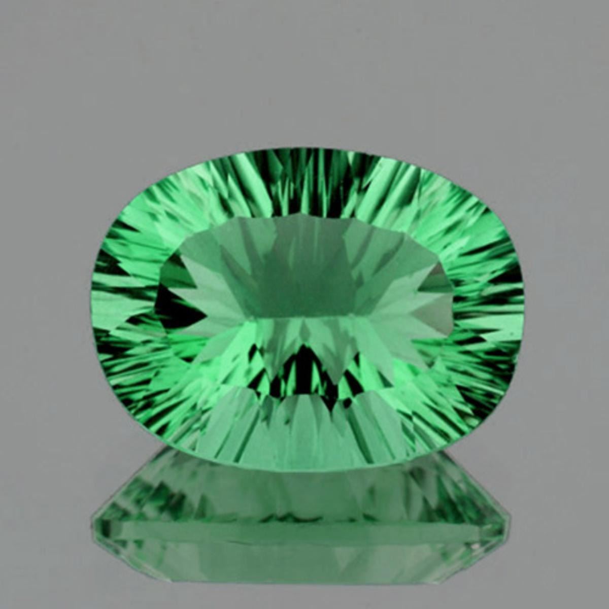 Natural Fluorite WEIGHT : 26.82 cts SHAPE : Oval (Concave Cut) SIZE ( L x W x D ) : 23.41 x 16.98 x 9.97 mm QUANTITY : 1 piece COLOR : Paraiba Green CLARITY : Flawless-VVS1 ORIGIN : Brazil; HARDNESS : 4-5 LUSTER : Excellent!!! TREATMENT : 100% Natural Unheated