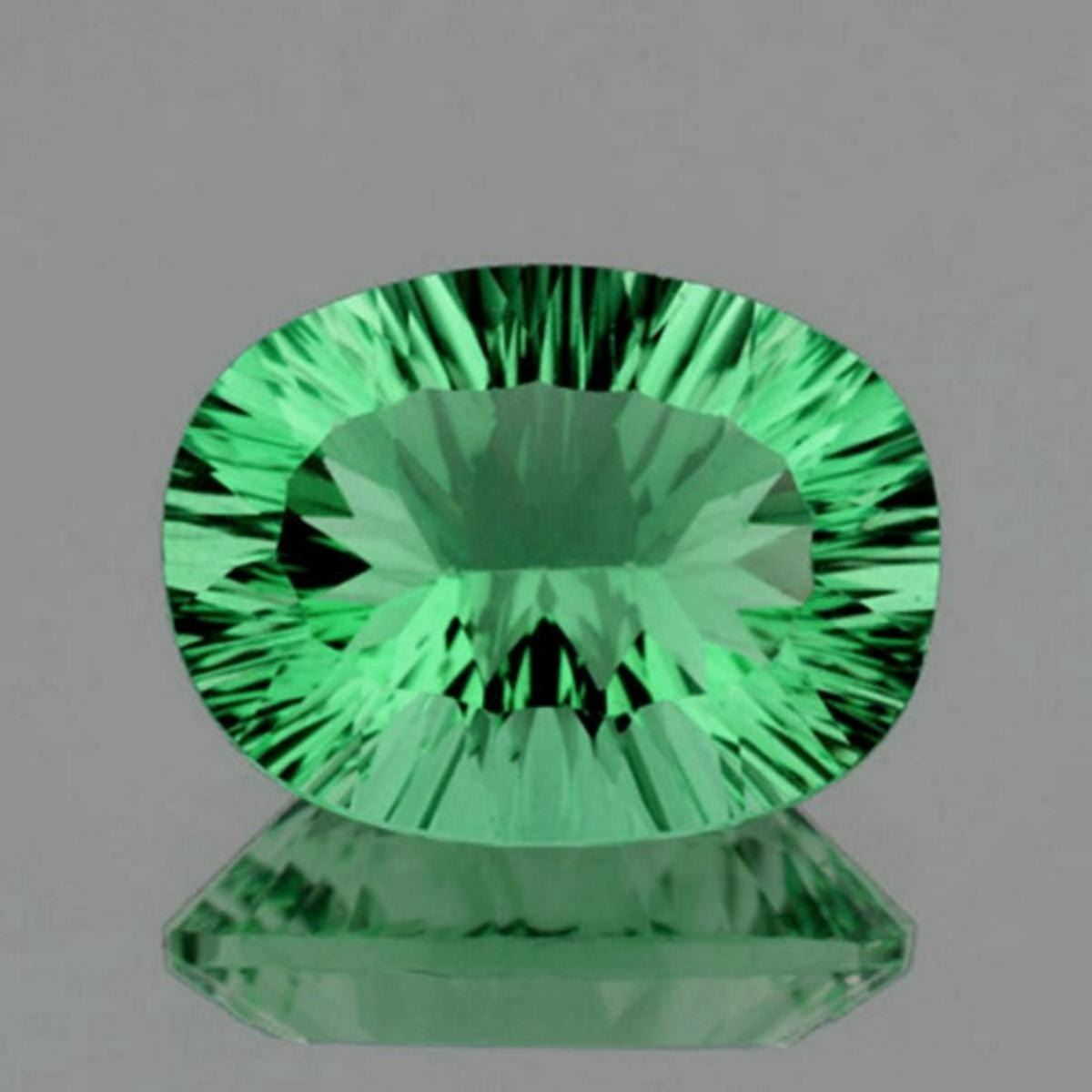 Natural Fluorite WEIGHT : 26.82 cts SHAPE : Oval (Concave Cut) SIZE ( L x W x D ) : 23.41 x 16.98 x 9.97 mm QUANTITY : 1 piece COLOR : Paraiba Green CLARITY : Flawless-VVS1 ORIGIN : Brazil; HARDNESS : 4-5 LUSTER : Excellent!!! TREATMENT : 100% Natural Unheated