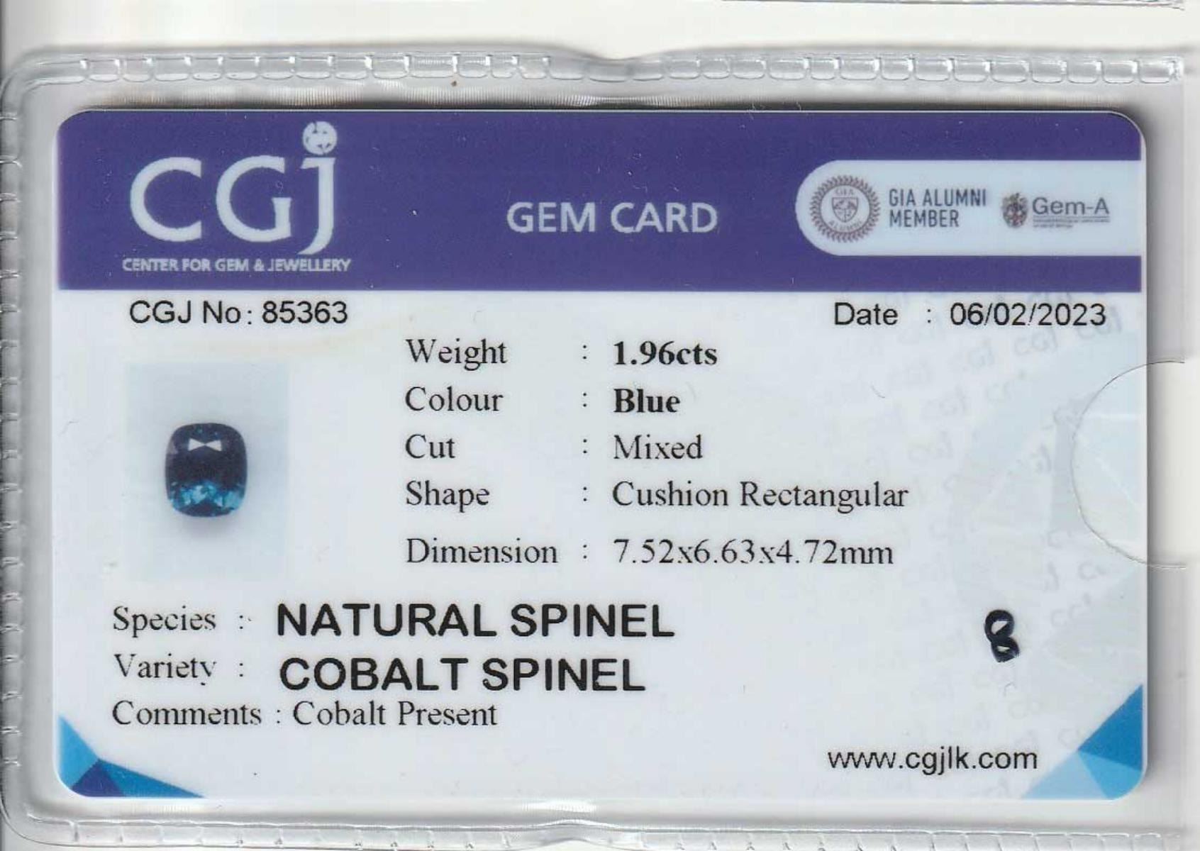 Natural Cushion Cobalt Blue Spinel 1.96 Cts- Untreated; Size - 7.52 x 6.63 MM; Eye Clean; Completely untreated ; Origin - Vietnam;
