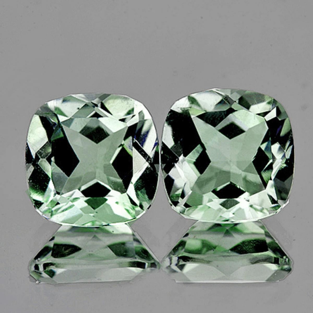 Natural Green Amethyst (Prasiolite)SIZE ( L x W x D ) : 10.00 mm;COLOR : Green;SHAPE : Cushion;QUANTITY : 2 piecesLUSTER : Excellent; CLARITY : FLAWLESS-VVS; BEST QUALITY;HARDNESS : 7;ORIGIN : Brazil; TREATMENT : 100% Natural Unheated;