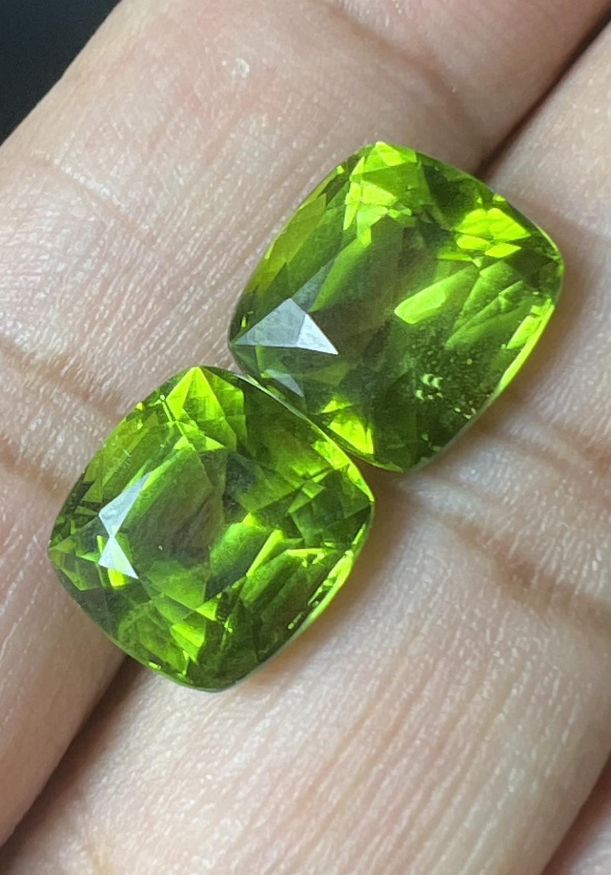 Natural Peridot; WEIGHT : 17.56 cts; SHAPE : Cushion; SIZE : 12.05 x 11.03 & 12.03 x 11.03 mm; QUANTITY : 2 pieces COLOR : Green; CLARITY : VVS; ORIGIN : PAKISTAN; HARDNESS : 7; LUSTER : Excellent!!! TREATMENT : UNHeated;