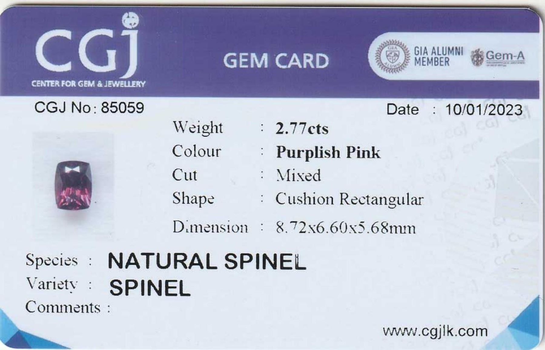 Natural Cushion Pink Spinel 2.77 Cts ; size 8.72 x 6.60 MM; Color Purple/Pink; Origin - Sri Lanka;