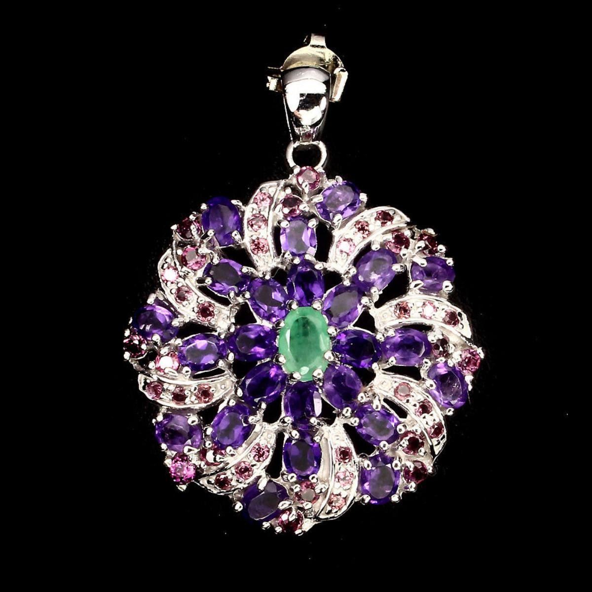 925 STERLING SILVER;PLATE.....14K WHITE GOLD;MAIN STONEEMERALDOTHER GEMSAMETHYST,RHODOLITE GARNETTOTAL WEIGHT36.06 GRAM (TOTAL WEIGHT OF SILVER + STONE)DIMENSION* STONE 1.5 TO 6.0 X 4.0 MM. * FACE PENDANT 39.0 X 30.0 MM.MAIN STONE SHAPEOVAL CUTMAIN STONE COLORMULTI-COLORCLARITY/GRADETRANSPARENTLUSTERDELIGHTFULTREATMENTUNHEATEDORIGINBRAZILHARDNESS7.0 - 8.0