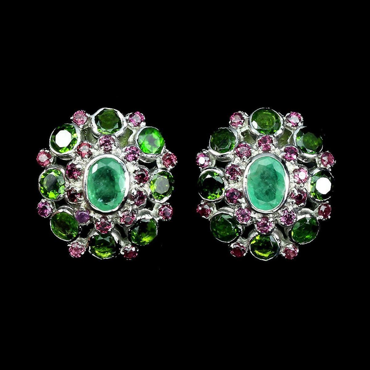 925 STERLING SILVER;PLATE-14K WHITE GOLD;MAIN STONE-EMERALD;OTHER GEMS-CHROME DIOPSIDE, RHODOLITE GARNET;TOTAL WEIGHT-10.35 GRAM (TOTAL WEIGHT OF SILVER + STONE)DIMENSION* STONE 2.0 TO 7.0 X 5.0 MM. * FACE EARRINGS 21.0 X 19.0 MM.MAIN STONE SHAPE-OVAL CUT;MAIN STONE COLOR-TOP RICH GREEN;CLARITY/GRADE-TRANSPARENT;LUSTER-GORGEOUS;TREATMENT-UNHEATED;ORIGIN-BRAZIL;HARDNESS-7.5 - 8.0;