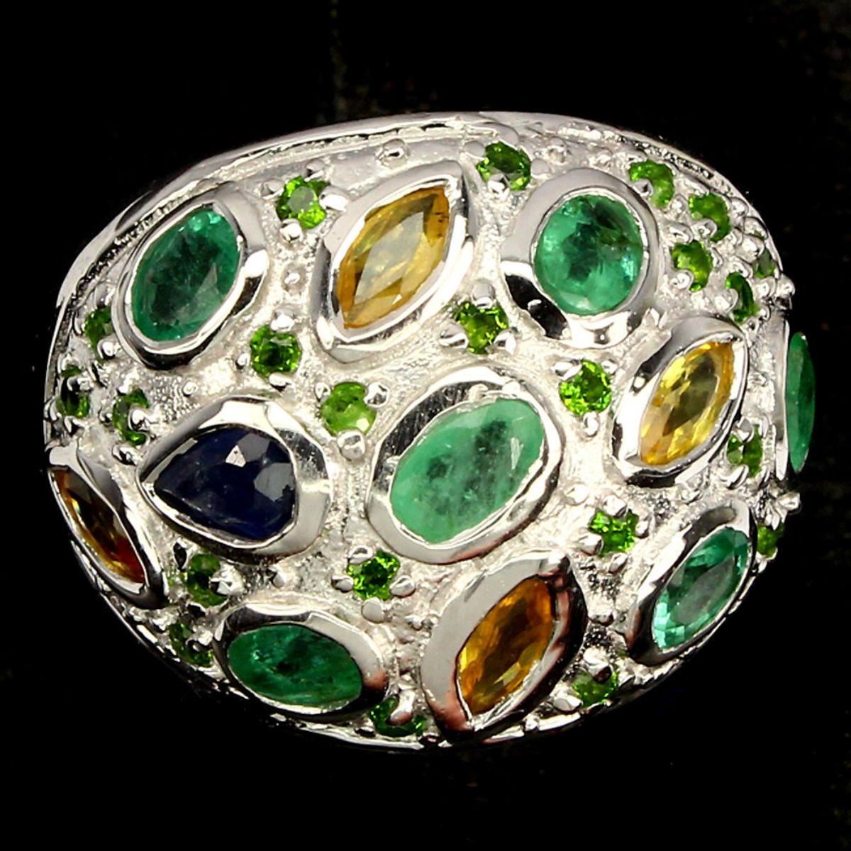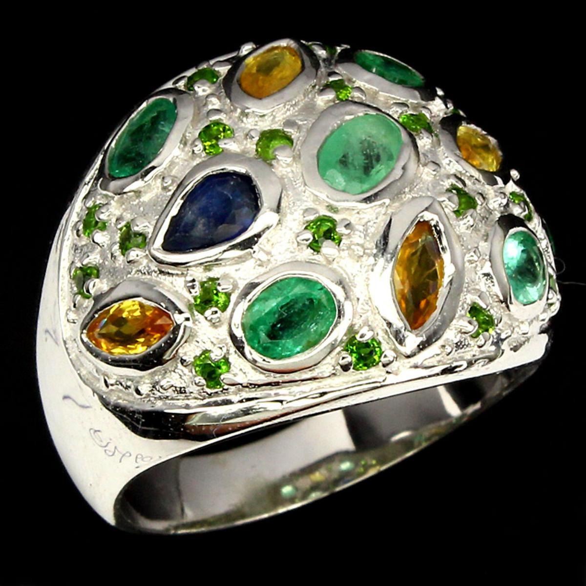 925 STERLING SILVER;PLATE014K WHITE GOLD;RING SIZE08.5;MAIN STONE-EMERALD;OTHER GEMS-CHROME DIOPSIDE,SAPPHIRE;TOTAL WEIGHT-41.56 CT (TOTAL WEIGHT OF SILVER + STONE)DIMENSION* STONE 1.5 TO 6.0 X 3.0 MM. * FACE RING 22.0 X 19.0 MM.MAIN STONE SHAPE-OVAL CUT;MAIN STONE COLOR-TOP RICH GREEN;TREATMENT-UNHEATED;ORIGIN-BRAZIL;