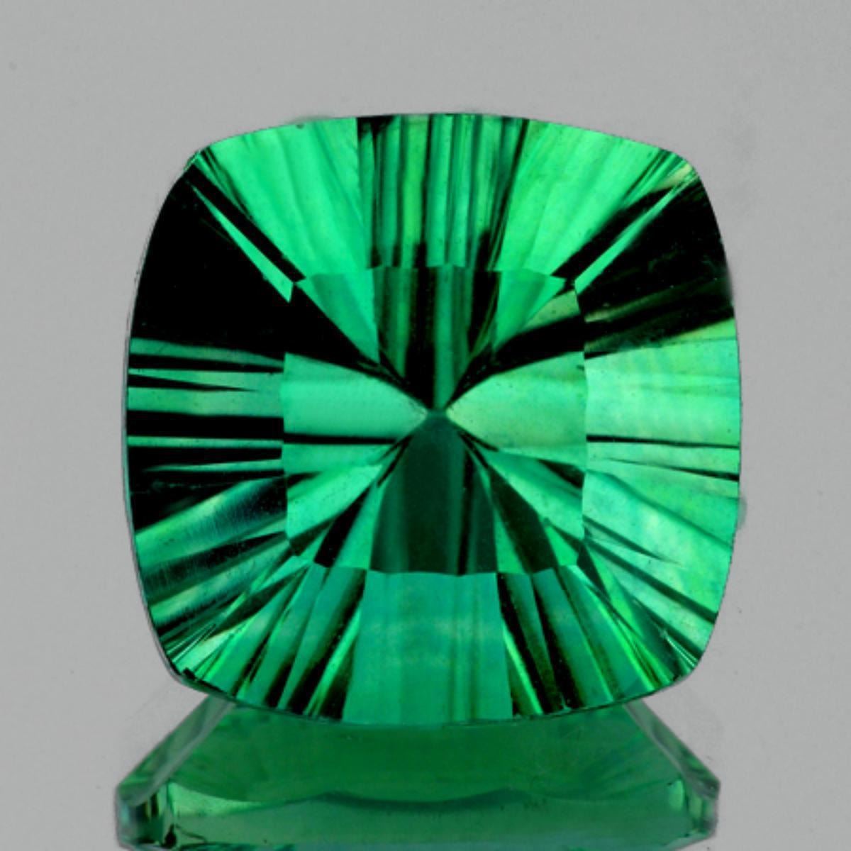 Natural Fluorite WEIGHT : 18.18 cts; SHAPE : Cushion (Concave Cut) SIZE ( L x W x D ) : 15.72 x 11.87 mm; QUANTITY : 1 piece; COLOR : Emerald Green Best AAA Color; CLARITY : Flawless-VVS1 AAA Grade ; ORIGIN : Brazil; HARDNESS : 4-5; LUSTER : Excellent!!! TREATMENT : 100% Natural Unheated