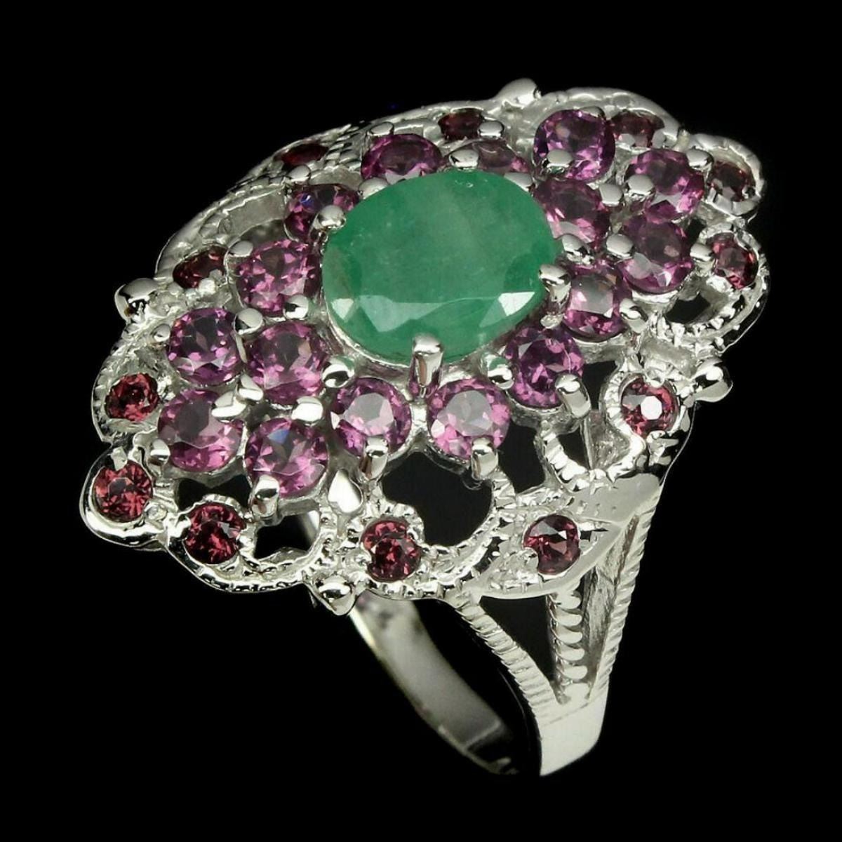 925 STERLING SILVER;PLATE-14K WHITE GOLD;RING SIZE--9(resizeable)MAIN STONE-EMERALD;OTHER GEMS-RHODOLITE GARNET;TOTAL WEIGHT-25.13 CT (TOTAL WEIGHT OF SILVER + STONE)DIMENSION* STONE 1.5 TO 8.0 X 6.0 MM. * RING SIZE 9.0 * FACE RING 25.0 X 18.0 MM.;MAIN STONE SHAPE-OVAL CUT;MAIN STONE COLOR-TOP RICH GREEN;CLARITY/GRADE-TRANSPARENT;TREATMENT-UNHEATED;ORIGIN-BRAZIL;HARDNESS7.5 - 8.0;
