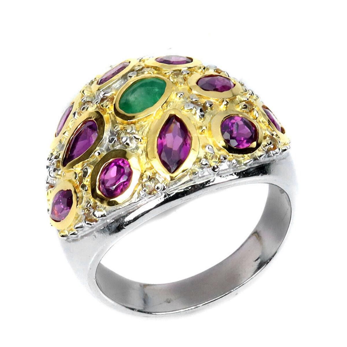 925 STERLING SILVER;PLATE-2-TONE WHITE & YELLOW 14K GOLD;RING SIZE/resizable--9;MAIN STONE-EMERALD;OTHER GEMS-RHODOLITE GARNET, SAPPHIRE;TOTAL WEIGHT-9.04 GRAM (TOTAL WEIGHT OF SILVER + STONE)DIMENSION-* STONE 1.5 TO 6.0 X 3.0 MM. * RING SIZE 9.0 * FACE RING- 23.0 X 19.0 MM.;MAIN STONE SHAPE-OVAL CUT;MAIN STONE COLOR-RICH GREEN;TREATMENT-UNHEATED;ORIGIN-BRAZIL;HARDNESS-7.5 - 8.0;