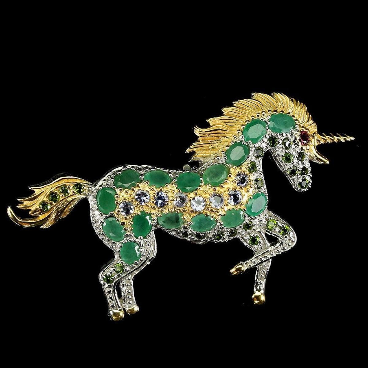 925 STERLING SILVER;PLATE-2-TONE WHITE & YELLOW 14K GOLD;MAIN STONE-EMERALD;OTHER GEMS-CHROME DIOPSIDE, RHODOLITE GARNET, TANZANITE;TOTAL WEIGHT-7.75 GRAM (TOTAL WEIGHT OF SILVER + STONE)DIMENSION-* STONE 1.5 TO 4.0 X 3.0 MM. * FACE BROOCH 54.0 X 33.0 MM.;MAIN STONE SHAPE-OVAL CUT;MAIN STONE COLOR-TOP RICH GREEN;CLARITY/GRADE-TRANSPARENT;LUSTER-AWESOME;TREATMENT-UNHEATED;