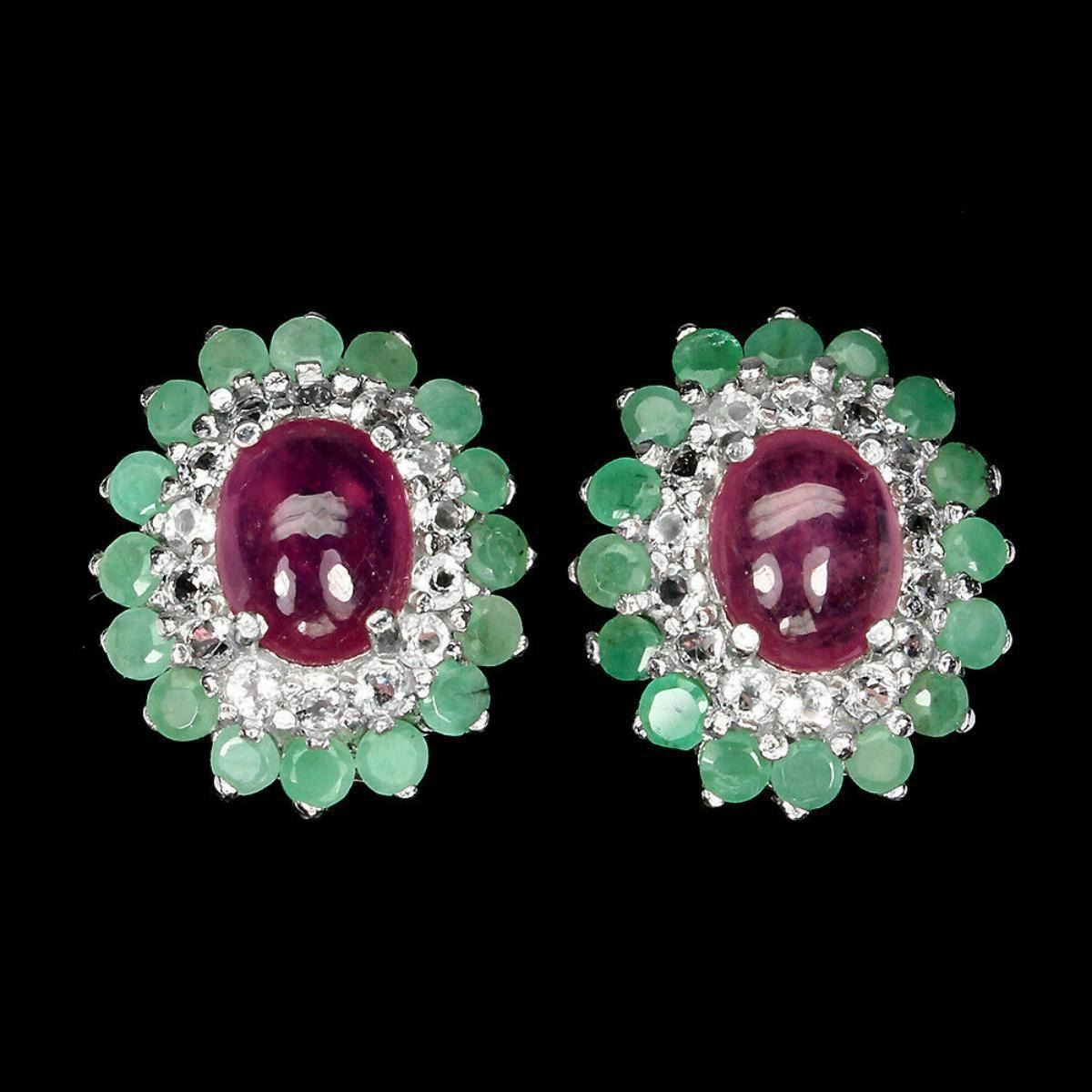 925 STERLING SILVER;PLATE-14K WHITE GOLD;MAIN STONE-RUBY;OTHER GEMS-EMERALD, WHITE TOPAZ;TOTAL WEIGHT-6.82 GRAM (TOTAL WEIGHT OF SILVER + STONE)DIMENSION-* STONE 2.0 TO 9.0 X 7.0 MM. * FACE EARRINGS 19.0 X 16.0 MM.MAIN STONE SHAPE-OVAL CABOCHON;MAIN STONE COLOR-TOP RICH RED PINK;;ORIGIN-MOZAMBIQUE;HARDNESS-9;