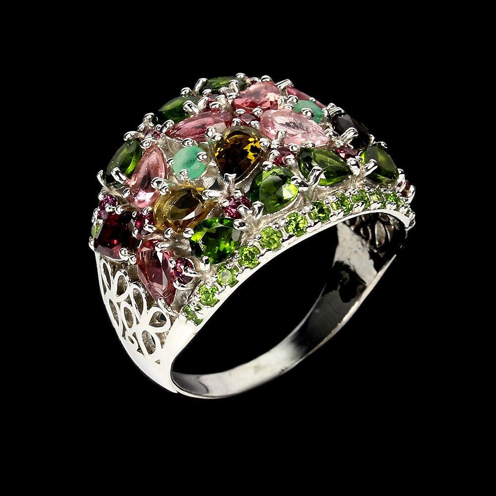 925 STERLING SILVER;PLATE-14K WHITE GOLD;;RING SIZE - 8.5(resizeable)MAIN STONE-TOURMALINE;OTHER GEMS-CHROME DIOPSIDE, EMERALD, RHODOLITE GARNET;TOTAL WEIGHT-5.88 GRAM (TOTAL WEIGHT OF SILVER + STONE)DIMENSION* STONE 1.0 TO 5.0 X 3.0 MM. * RING SIZE 8.5 * FACE RING 22.0 X 13.0 MM.;MAIN STONE SHAPE-PEAR CUT;MAIN STONE COLOR-MULTI-COLOR;;TREATMENT-UNHEATED;ORIGIN-BRAZIL;HARDNESS-5.0 - 8.0;