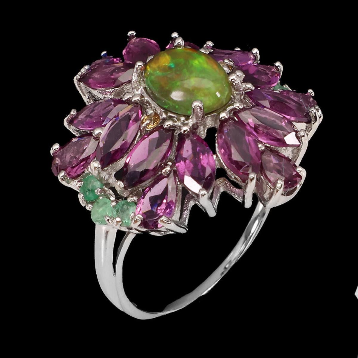 925 STERLING SILVER;PLATE-14K WHITE GOLD;RING SIZE-7.5(RESIZABLE);MAIN STONE-BLACK OPAL;OTHER GEMS-EMERALD, RHODOLITE GARNET;TOTAL WEIGHT-4.35 GRAM (TOTAL WEIGHT OF SILVER + STONE);DIMENSION-* STONE 1.5 TO 8.0 X 6.0 MM.* RING SIZE 7.5* FACE RING 23.0 X 22.0 MM.;MAIN STONE SHAPE-OVAL CABOCHON;MAIN STONE COLOR- BLACK;TREATMENT-YES;ORIGIN-ETHIOPIA;HARDNESS-5.5 - 6.5;
