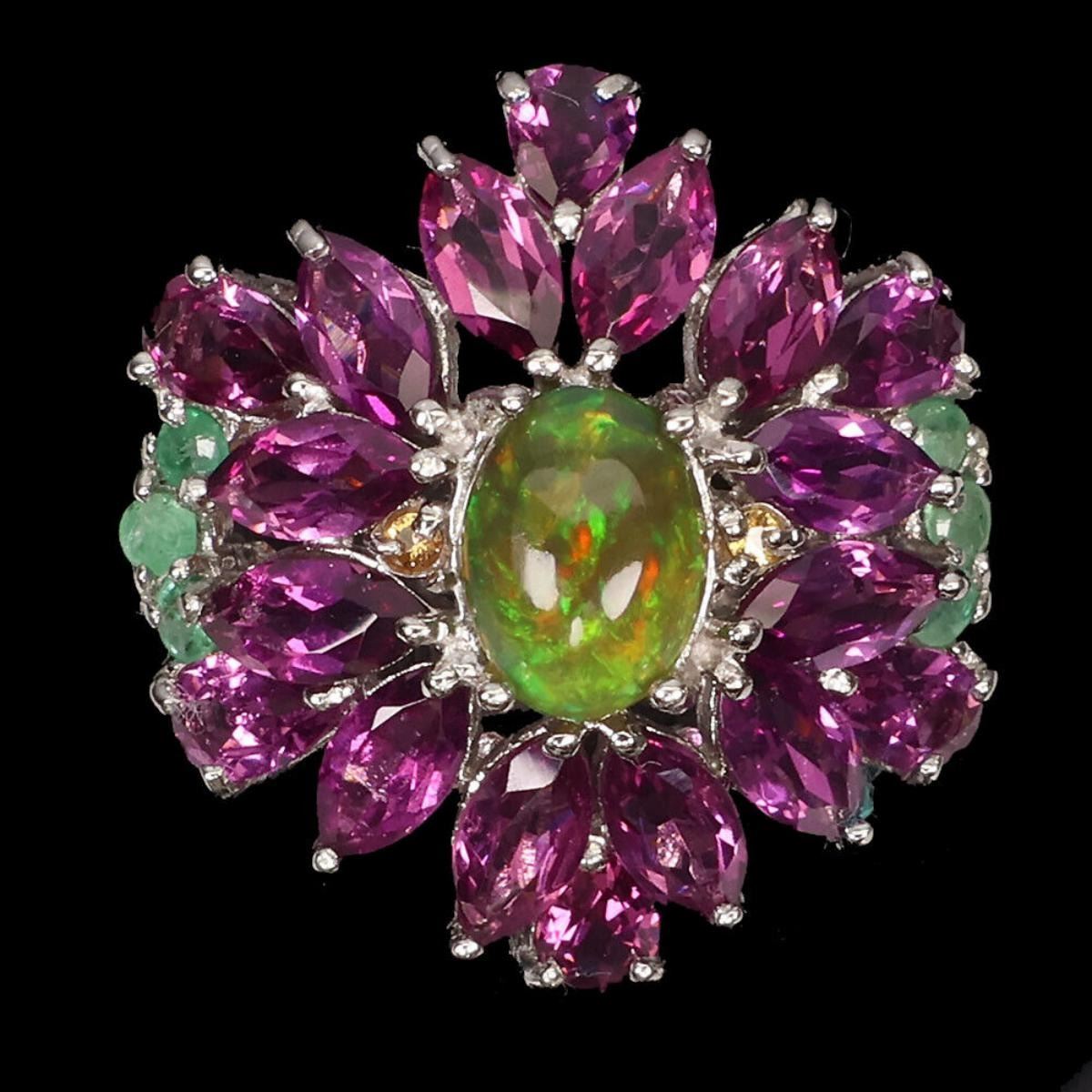 925 STERLING SILVER;PLATE-14K WHITE GOLD;RING SIZE-7.5(RESIZABLE);MAIN STONE-BLACK OPAL;OTHER GEMS-EMERALD, RHODOLITE GARNET;TOTAL WEIGHT-4.35 GRAM (TOTAL WEIGHT OF SILVER + STONE);DIMENSION-* STONE 1.5 TO 8.0 X 6.0 MM.* RING SIZE 7.5* FACE RING 23.0 X 22.0 MM.;MAIN STONE SHAPE-OVAL CABOCHON;MAIN STONE COLOR- BLACK;TREATMENT-YES;ORIGIN-ETHIOPIA;HARDNESS-5.5 - 6.5;