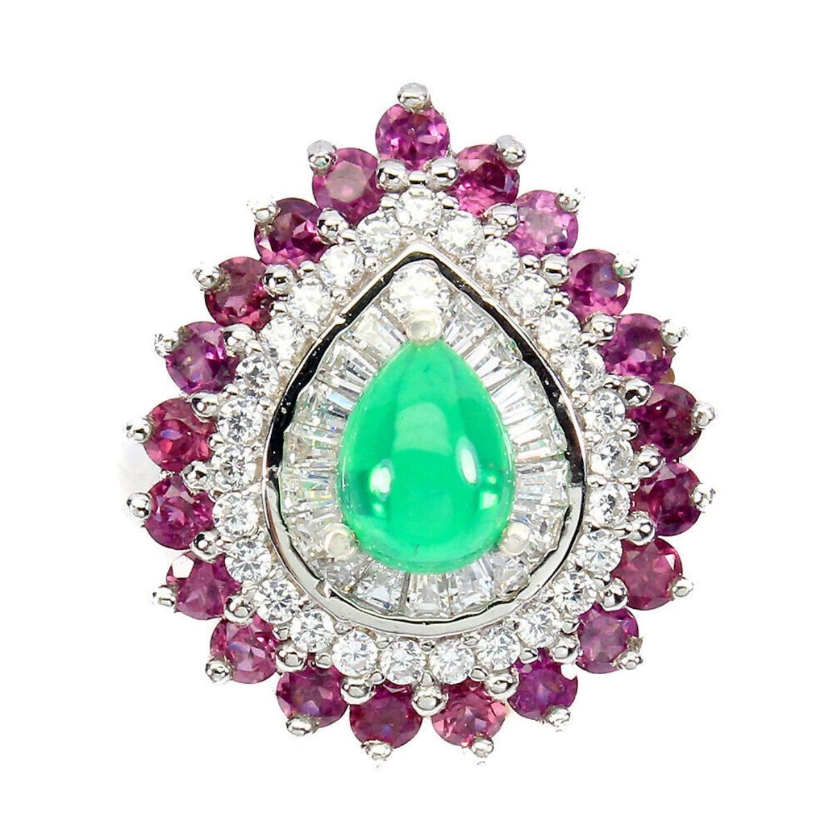 925 STERLING SILVER;PLATE-14K WHITE GOLD;RING SIZE-7(RESIZABLE);MAIN STONE-GREEN OPAL;OTHER GEMS- RHODOLITE GARNET;TOTAL WEIGHT-7.26 GRAM (TOTAL WEIGHT OF SILVER + STONE);DIMENSION-* STONE 2.5 TO 8.0 X 6.0 MM.* RING SIZE 7.0* FACE RING 23.0 X 20.0 MM.;MAIN STONE SHAPE-PEAR CABOCHON;MAIN STONE COLOR-GREEN;TREATMENT-YES;ORIGIN-ETHIOPIA;HARDNESS-5;