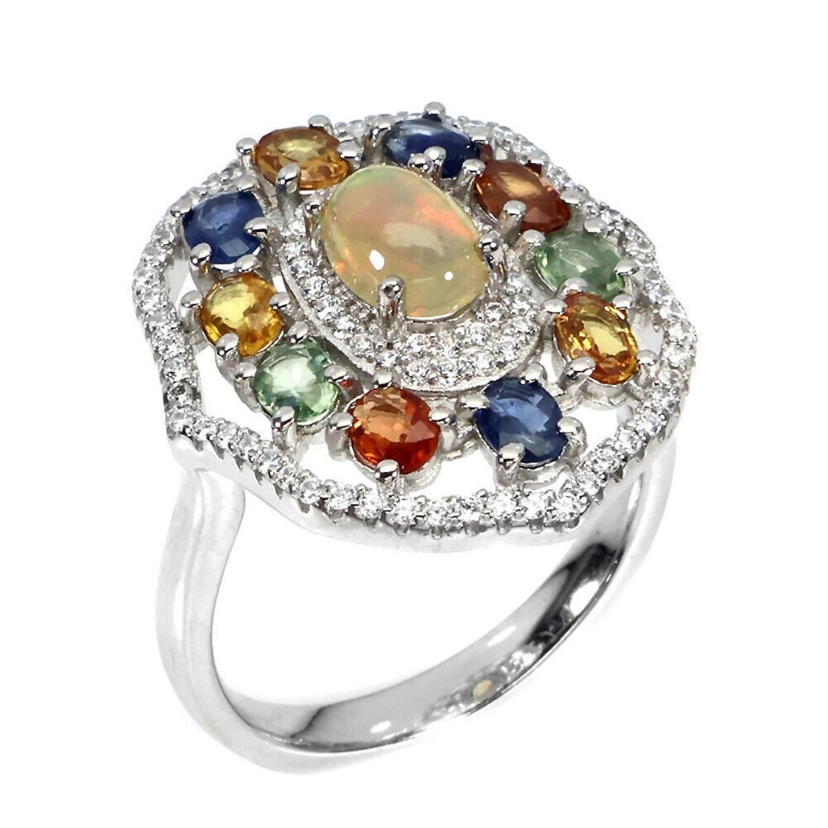 925 STERLING SILVER;PLATE-14K WHITE GOLD;RING SIZE-8(RESIZABLE);MAIN STONE-WHITE OPAL;OTHER GEMS-SAPPHIRE, WHITE TOPAZ;TOTAL WEIGHT-5.68 GRAM (TOTAL WEIGHT OF SILVER + STONE);DIMENSION-* STONE 1.0 TO 7.0 X 5.0 MM.* RING SIZE 8.0* FACE RING 23.0 X 19.0 MM.;MAIN STONE SHAPE-OVAL CABOCHON;MAIN STONE COLOR-WHITE ;TREATMENT-UNHEATED;ORIGIN-ETHIOPIA;HARDNESS-5.5 - 6.5;