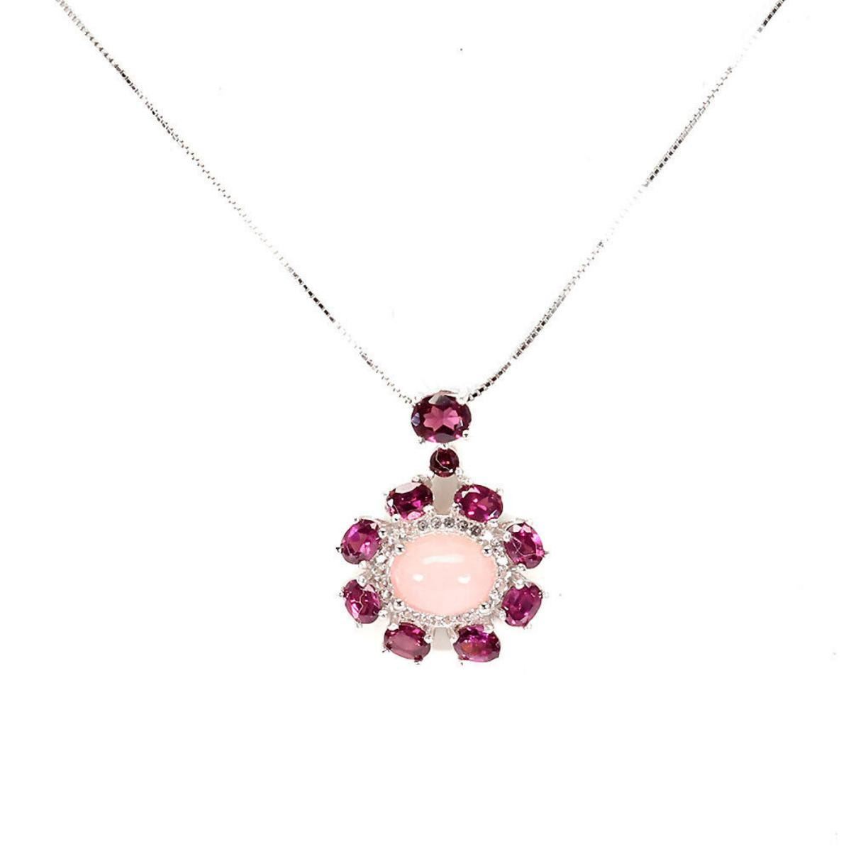 925 STERLING SILVER;PLATE-14K WHITE GOLD;LENGTH (INCHES)-18;MAIN STONE-PINK OPAL;OTHER GEMS-RHODOLITE GARNET, WHITE TOPAZ;TOTAL WEIGHT-3.78 GRAM (TOTAL WEIGHT OF SILVER + STONE);DIMENSION-* STONE 1.0 TO 9.0 X 7.0 MM. * TOTAL LENGTH 18.0 INCHES. * STONES PART LENGTH 24.0 X 18.0 MM.;MAIN STONE SHAPE-OVAL CABOCHON;MAIN STONE COLOR-PINK;TREATMENT-UNHEATED;ORIGIN-ETHIOPIA;HARDNESS-5.5 - 6.5;