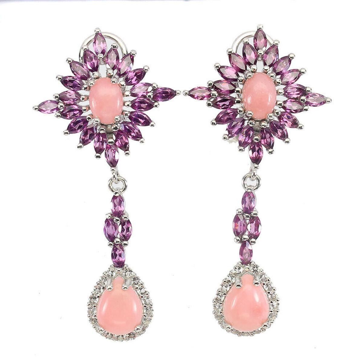 925 STERLING SILVER;PLATE-14K WHITE GOLD;MAIN STONE-PINK OPAL;OTHER GEMS-RHODOLITE GARNET, WHITE TOPAZ;TOTAL WEIGHT-8.16 GRAM (TOTAL WEIGHT OF SILVER + STONE);DIMENSION-* STONE 1.5 TO 9.0 X 7.0 MM.* FACE EARRINGS 48.0 X 22.0 MM.;MAIN STONE SHAPE-OVAL CABOCHON;MAIN STONE COLOR-PINK;TREATMENT-UNHEATED;ORIGIN-ETHIOPIA;HARDNESS-5.5 - 6.5;