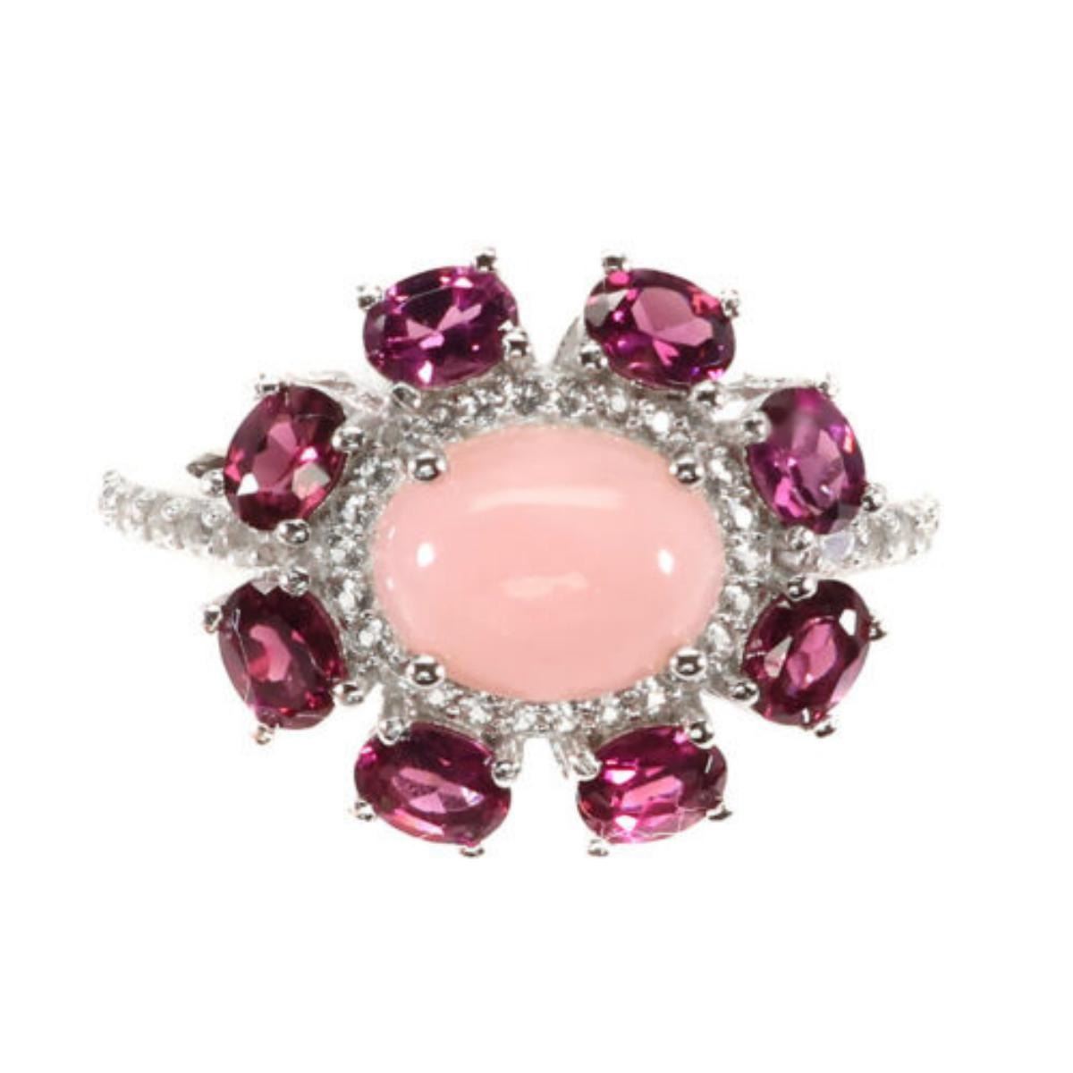 925 STERLING SILVER;PLATE-14K WHITE GOLD;RING SIZE-8.5(RESIZABLE);MAIN STONE-PINK OPAL;OTHER GEMS-RHODOLITE GARNET, WHITE TOPAZ;TOTAL WEIGHT-4.14 GRAM (TOTAL WEIGHT OF SILVER + STONE);DIMENSION-* STONE 1.0 TO 9.0 X 7.0 MM. * RING SIZE 8.5 * FACE RING 24.0 X 16.0 MM.;MAIN STONE SHAPE-OVAL CABOCHON;MAIN STONE COLOR-PINK;TREATMENT-UNHEATED;ORIGIN-ETHIOPIA;HARDNESS-5.5 - 6.5;