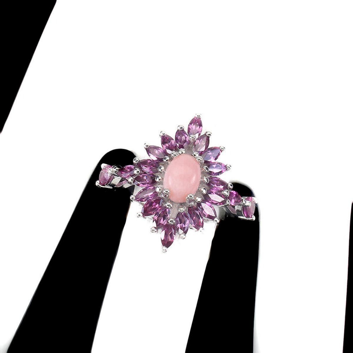 925 STERLING SILVER;PLATE-14K WHITE GOLD;RING SIZE-8(RESIZABLE);MAIN STONE-PINK OPAL;OTHER GEMS-RHODOLITE GARNET, WHITE TOPAZ;TOTAL WEIGHT-3.7 GRAM (TOTAL WEIGHT OF SILVER + STONE);DIMENSION-* STONE 4.0 X 2.0 TO 7.0 X 5.0 MM.* RING SIZE 8.0* FACE RING 24.0 X 21.0 MM.;MAIN STONE SHAPE-OVAL CABOCHON;MAIN STONE COLOR-PINK;TREATMENT-UNHEATED;ORIGIN-ETHIOPIA;HARDNESS-5.5 - 6.5;