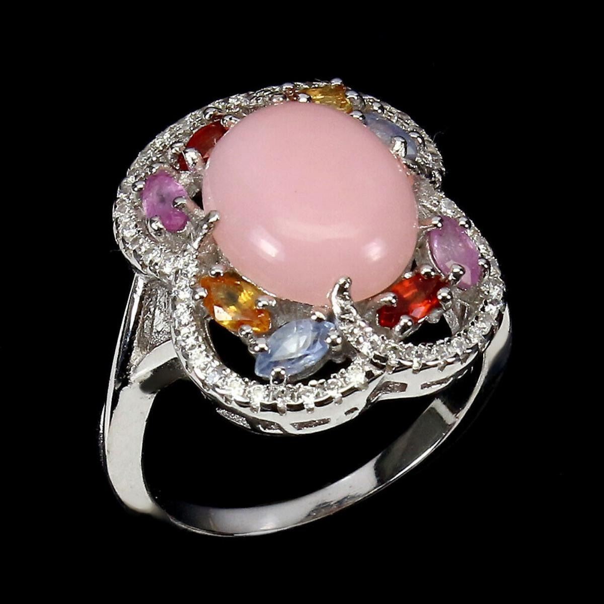 925 STERLING SILVER;PLATE-14K WHITE GOLD;RING SIZE-7(RESIZABLE);MAIN STONE-PINK OPAL;OTHER GEMS-SAPPHIRE, WHITE TOPAZ;TOTAL WEIGHT-5.15 GRAM (TOTAL WEIGHT OF SILVER + STONE);DIMENSION-* STONE 1.0 TO 11.0 X 9.0 MM.* RING SIZE 7.0* FACE RING 18.0 X 15.0 MM.;MAIN STONE SHAPE-OVAL CABOCHON;MAIN STONE COLOR- PINK;TREATMENT-UNHEATED;ORIGIN-ETHIOPIA;HARDNESS-5.5 - 6.5;