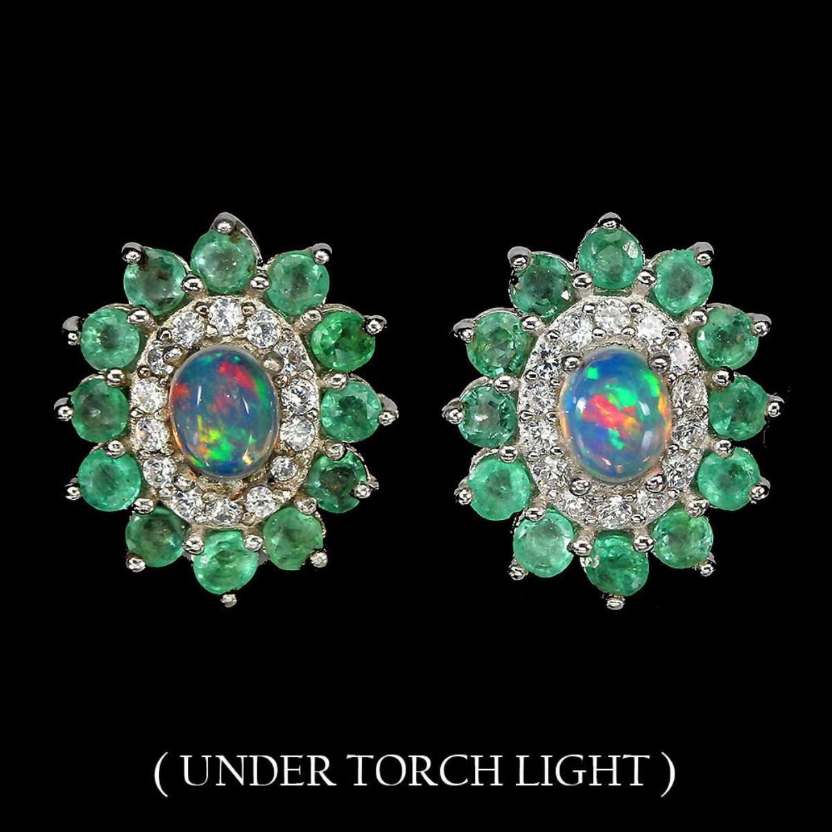 925 STERLING SILVER;PLATE-14K WHITE GOLD;MAIN STONE-WHITE OPAL;OTHER GEMS- EMERALD;TOTAL WEIGHT-3.49 GRAM (TOTAL WEIGHT OF SILVER + STONE);DIMENSION-* STONE 2.5 TO 5.0 X 4.0 MM.* FACE EARRINGS 14.0 X 13.0 MM.;MAIN STONE SHAPE-OVAL CABOCHON;MAIN STONE COLOR-WHITE;TREATMENT-UNHEATED;ORIGIN-ETHIOPIA/COLOMBIA;HARDNESS-5.5 - 6.5;