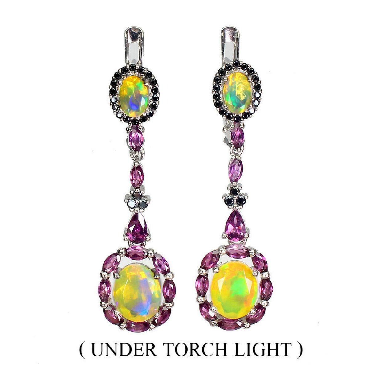 925 STERLING SILVER;PLATE-14K WHITE GOLD;MAIN STONE-WHITE OPAL;OTHER GEMS-BLACK SPINEL, RHODOLITE GARNET;TOTAL WEIGHT-5.58 GRAM (TOTAL WEIGHT OF SILVER + STONE);DIMENSION-* STONE 1.0 TO 9.0 X 7.0 MM. * FACE EARRINGS 40.0 X 12.0 MM.;MAIN STONE SHAPE-OVAL CUT;MAIN STONE COLOR-RAINBOW;CLARITY/GRADE-IF;TREATMENT-UNHEATED;ORIGIN-ETHIOPIA;HARDNESS-5.5 - 6.5;