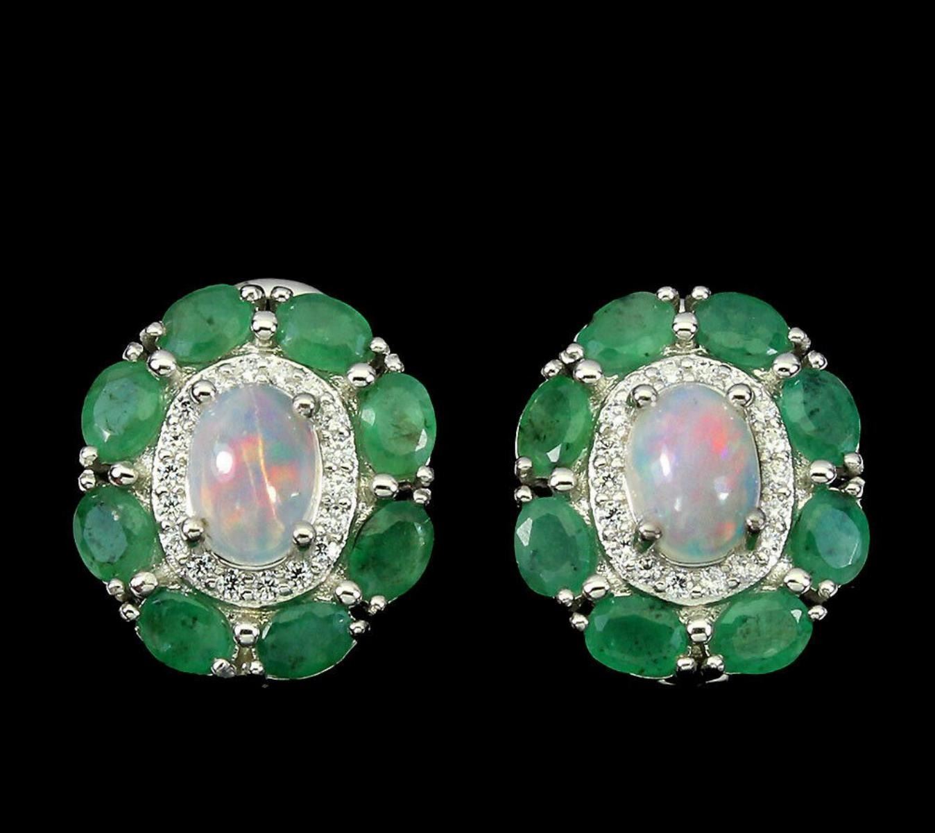925 STERLING SILVER;PLATE-14K WHITE GOLD;MAIN STONE-WHITE OPAL;OTHER GEMS- EMERALD;TOTAL WEIGHT-5.98 GRAM (TOTAL WEIGHT OF SILVER + STONE);DIMENSION-* STONE 4.0 X 3.0 TO 7.0 X 5.0 MM.* FACE EARRINGS 15.0 X 13.0 MM.;MAIN STONE SHAPE-OVAL CABOCHON;MAIN STONE COLOR-WHITE;TREATMENT-UNHEATED;ORIGIN-ETHIOPIA;HARDNESS-5.5 - 6.5;