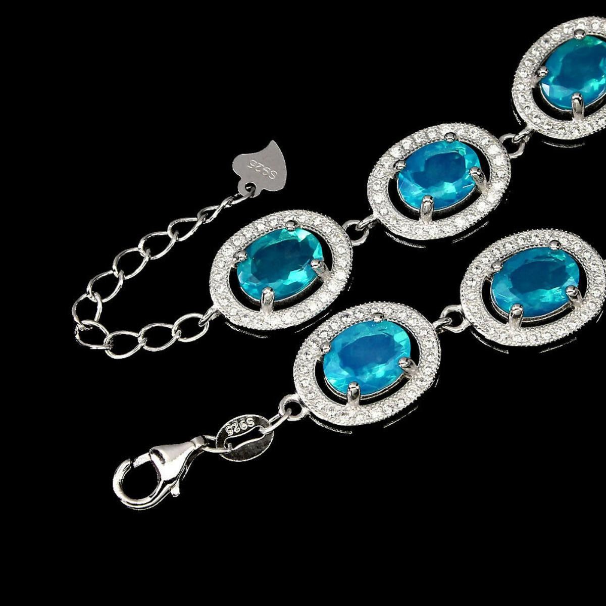 925 STERLING SILVER;PLATE-14K WHITE GOLD;LENGTH (INCHES)-8;MAIN STONE-BLUE FIRE OPAL;OTHER GEMS-CUBIC ZIRCONIA;TOTAL WEIGHT-64.04 CT (TOTAL WEIGHT OF SILVER + STONE)DIMENSION* STONE 8.0 X 6.0 MM. * CZ 1.0 MM. * FACE BRACELET 160.0 X 11.0 MM.;MAIN STONE SHAPE-OVAL CUT;MAIN STONE COLOR-TOP RICH BLUE;CLARITY/GRADE-IF;ORIGIN-ETHIOPIA;HARDNESS-5.5 - 6.5;