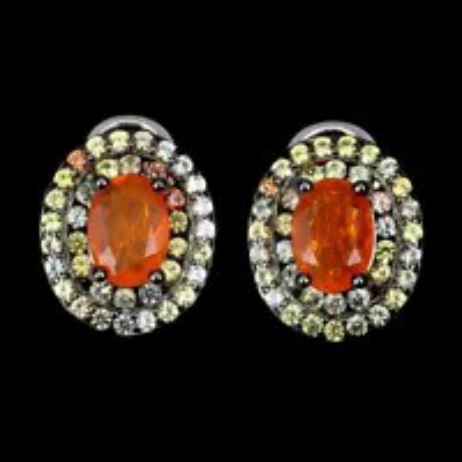 925 STERLING SILVER;PLATE-14K WHITE GOLD;MAIN STONE-ORANGE FIRE OPAL;OTHER GEMS-SAPPHIRE;TOTAL WEIGHT-4.08 GRAM (TOTAL WEIGHT OF SILVER + STONE)DIMENSION-* STONE 1.5 TO 7.0 X 5.0 MM. * FACE EARRINGS 13.0 X 11.0 MM.;MAIN STONE SHAPE-OVAL CUT;MAIN STONE COLOR-TOP RICH ORANGE;ORIGIN-ETHIOPIA;HARDNESS-5