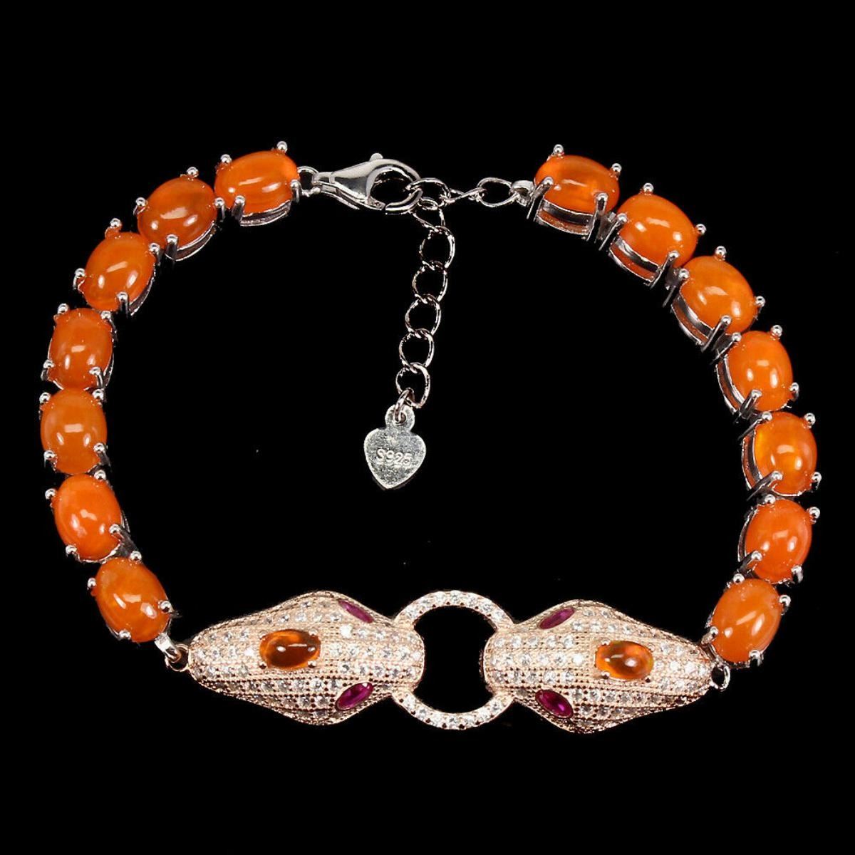925 STERLING SILVER;PLATE-2-TONE WHITE & ROSE 14K GOLD;LENGTH (INCHES)7;MAIN STONE-ORANGE FIRE OPALOTHER GEMS-CUBIC ZIRCONIA;TOTAL WEIGHT-13.7 GRAM (TOTAL WEIGHT OF SILVER + STONE)DIMENSION* STONE 5.0 X 3.0 TO 7.0 X 5.0 MM. * CZ 1.0 TO 5.0 X 2.0 MM. * FACE BRACELET 150.0 X 11.0 MM.;MAIN STONE SHAPE-OVAL CABOCHON;MAIN STONE COLOR-TOP RICH ORANGE;ORIGIN-ETHIOPIA;HARDNESS-5