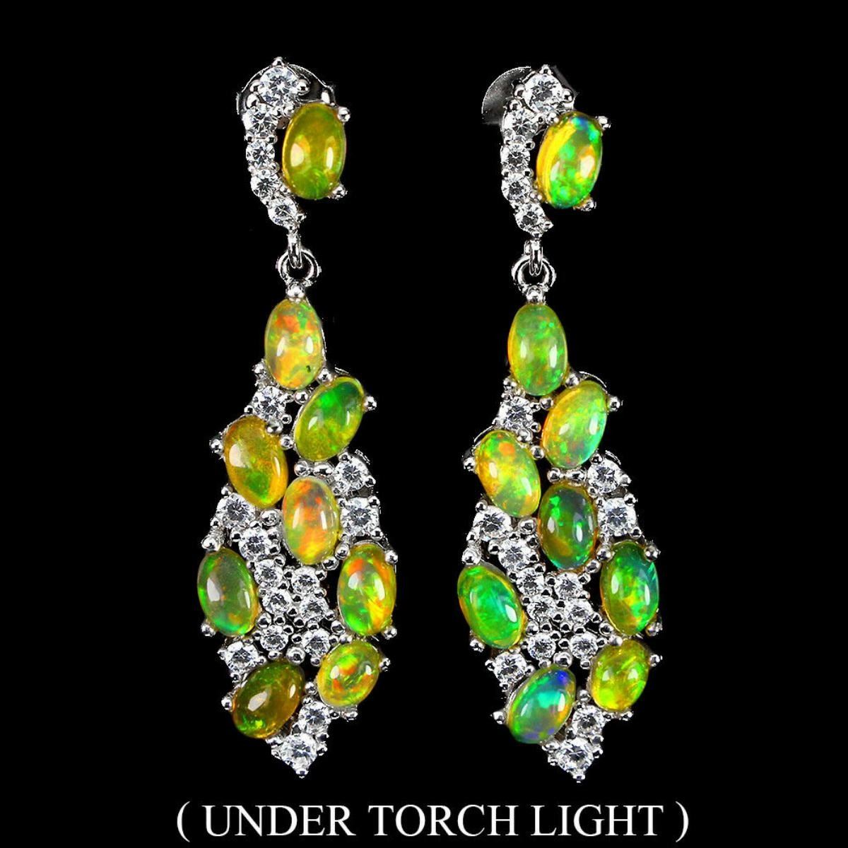 925 STERLING SILVER;PLATE-14K WHITE GOLD;MAIN STONE-FIRE OPAL;TOTAL WEIGHT-5.38 GRAM (TOTAL WEIGHT OF SILVER + STONE)DIMENSION-* STONE 4.0 X 3.0 TO 5.0 X 3.0 MM. * CZ 1.5 TO 2.5 MM. * FACE EARRINGS- 38.0 X 10.0 MM.;MAIN STONE SHAPE--OVAL CABOCHON;MAIN STONE COLOR-RAINBOW;TREATMENT-UNHEATED;ORIGIN-ETHIOPIA;HARDNESS-5;