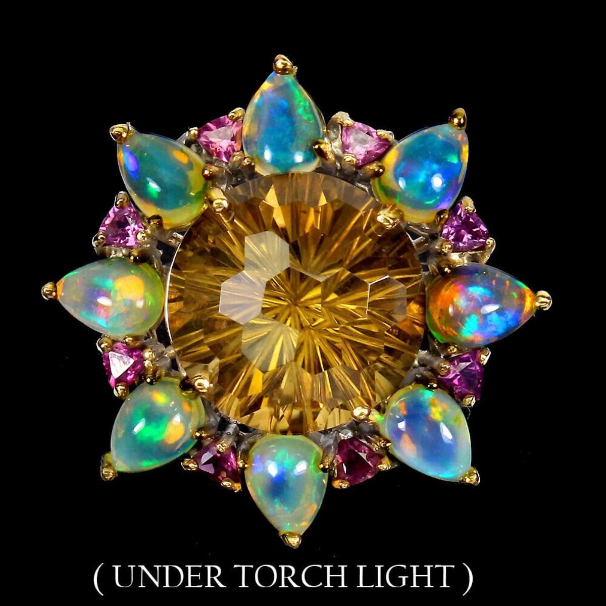 925 STERLING SILVER-PLATE2-TONE WHITE & YELLOW 14K GOLD-;RING SIZE/Resizeable-8.5;MAIN STONECITRINE-;OTHER GEMSWhite OPAL, RHODOLITE GARNET;TOTAL WEIGHT11.24 GRAM (TOTAL WEIGHT OF SILVER + STONE)DIMENSION* STONE 3.0 TO 16.0 MM.;* RING SIZE 8.5;* FACE RING 31.0 X 30.0 MM.;MAIN STONE SHAPEROUND BRILLIANT CUT WITH BALL CUT;MAIN STONE COLOR RICH YELLOW;CLARITY/GRADEIF TO VVS;TREATMENTUNHEATED;ORIGINBRAZIL;HARDNESS7;