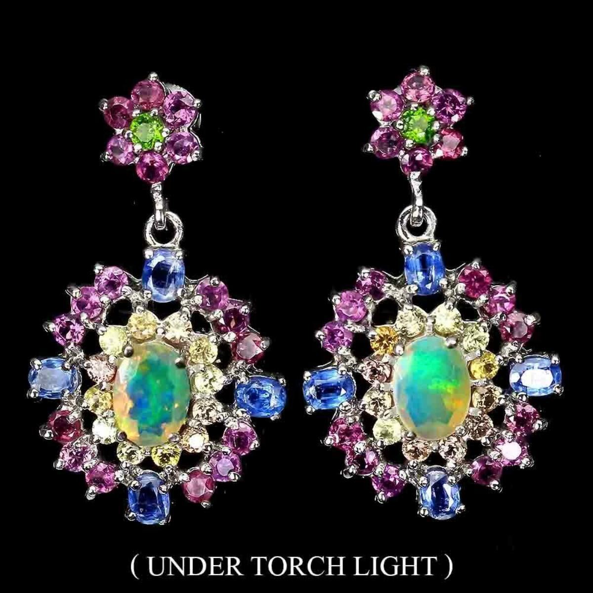 925 STERLING SILVER;PLATE-14K WHITE GOLD;MAIN STONE-FIRE OPAL;OTHER GEMS-CHROME DIOPSIDE, KYANITE, RHODOLITE GARNET, SAPPHIRE;TOTAL WEIGHT-11.61 GRAM (TOTAL WEIGHT OF SILVER + STONE)DIMENSION-* STONE 2.5 TO 8.0 X 6.0 MM.;* FACE EARRINGS -35.0 X 20.0 MM.;MAIN STONE SHAPE-OVAL CUT;TREATMENT-UNHEATED;ORIGIN-ETHIOPIA;HARDNESS-5.5 - 6.5;