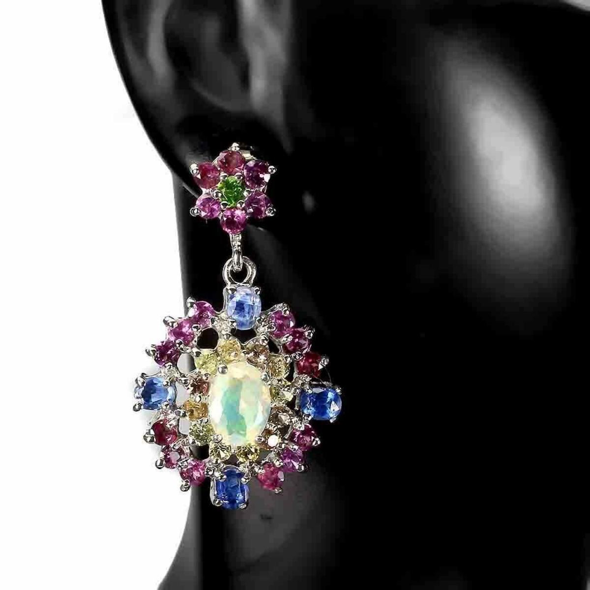 925 STERLING SILVER;PLATE-14K WHITE GOLD;MAIN STONE-FIRE OPAL;OTHER GEMS-CHROME DIOPSIDE, KYANITE, RHODOLITE GARNET, SAPPHIRE;TOTAL WEIGHT-11.61 GRAM (TOTAL WEIGHT OF SILVER + STONE)DIMENSION-* STONE 2.5 TO 8.0 X 6.0 MM.;* FACE EARRINGS -35.0 X 20.0 MM.;MAIN STONE SHAPE-OVAL CUT;TREATMENT-UNHEATED;ORIGIN-ETHIOPIA;HARDNESS-5.5 - 6.5;