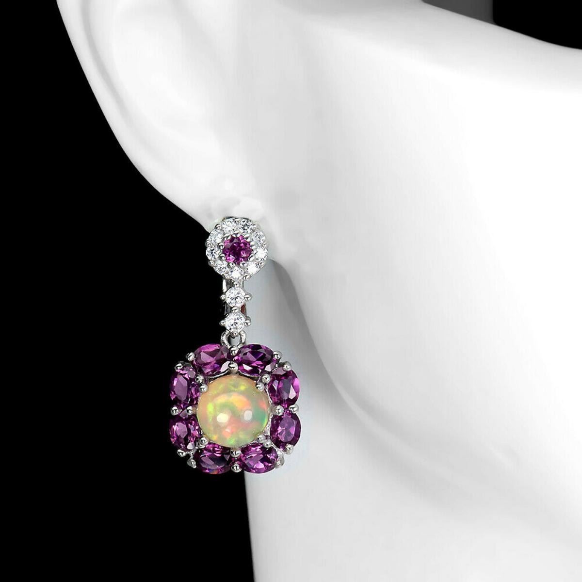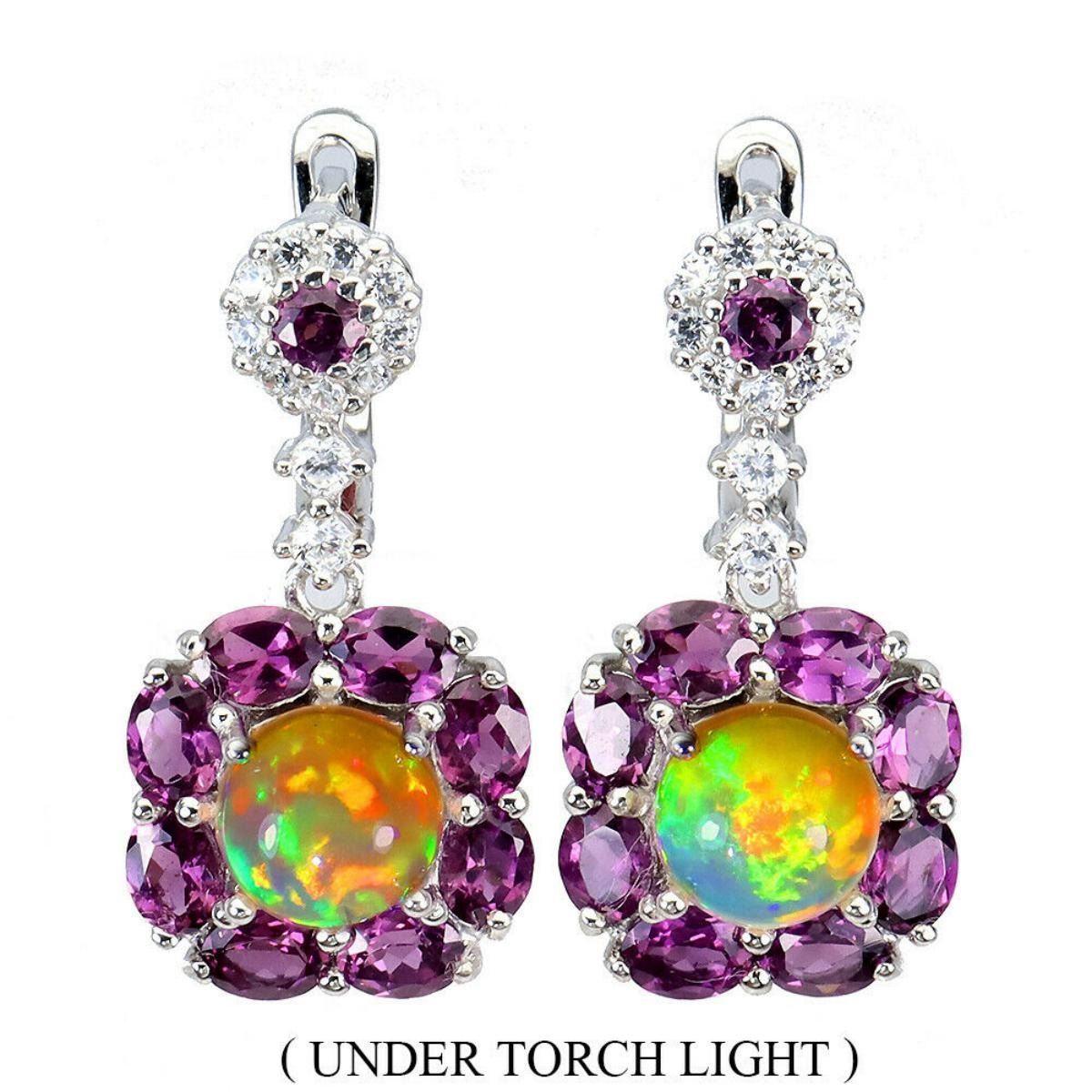 925 STERLING SILVER;PLATE-14K WHITE GOLD;MAIN STONE-FIRE OPAL;OTHER GEMS- RHODOLITE GARNET;TOTAL WEIGHT-6 GRAM (TOTAL WEIGHT OF SILVER + STONE);DIMENSION-* STONE 3.0 TO 7.0 MM.;* FACE EARRINGS-25.0 X 13.0 MM.;MAIN STONE SHAPE-ROUND CABOCHON;MAIN STONE COLOR-RAINBOW FULL FLASH;TREATMENT-UNHEATED;ORIGIN-ETHIOPIA;HARDNESS-5.5 - 6.5;