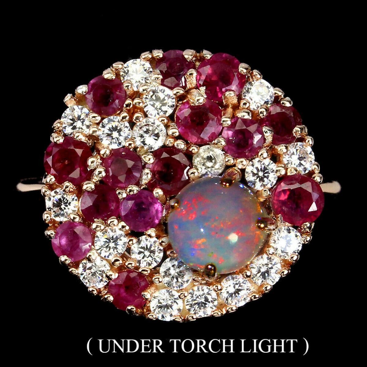 925 STERLING SILVER;;PLATE-14K ROSE GOLDRING SIZE/resizeable-8;MAIN STONE-FIRE OPALOTHER GEMS- RUBYTOTAL WEIGHT-4.35 GRAM (TOTAL WEIGHT OF SILVER + STONE)DIMENSION-* STONE 2.5 TO 6.0 MM. * CZ 2.0 MM. * RING SIZE 8.0 * FACE RING 17.0 X 17.0 MM.MAIN STONE SHAPE-ROUND CABOCHONMAIN STONE COLOR-RAINBOW FULL FLASHORIGIN-ETHIOPIA;HARDNESS-5.5 - 6.5;
