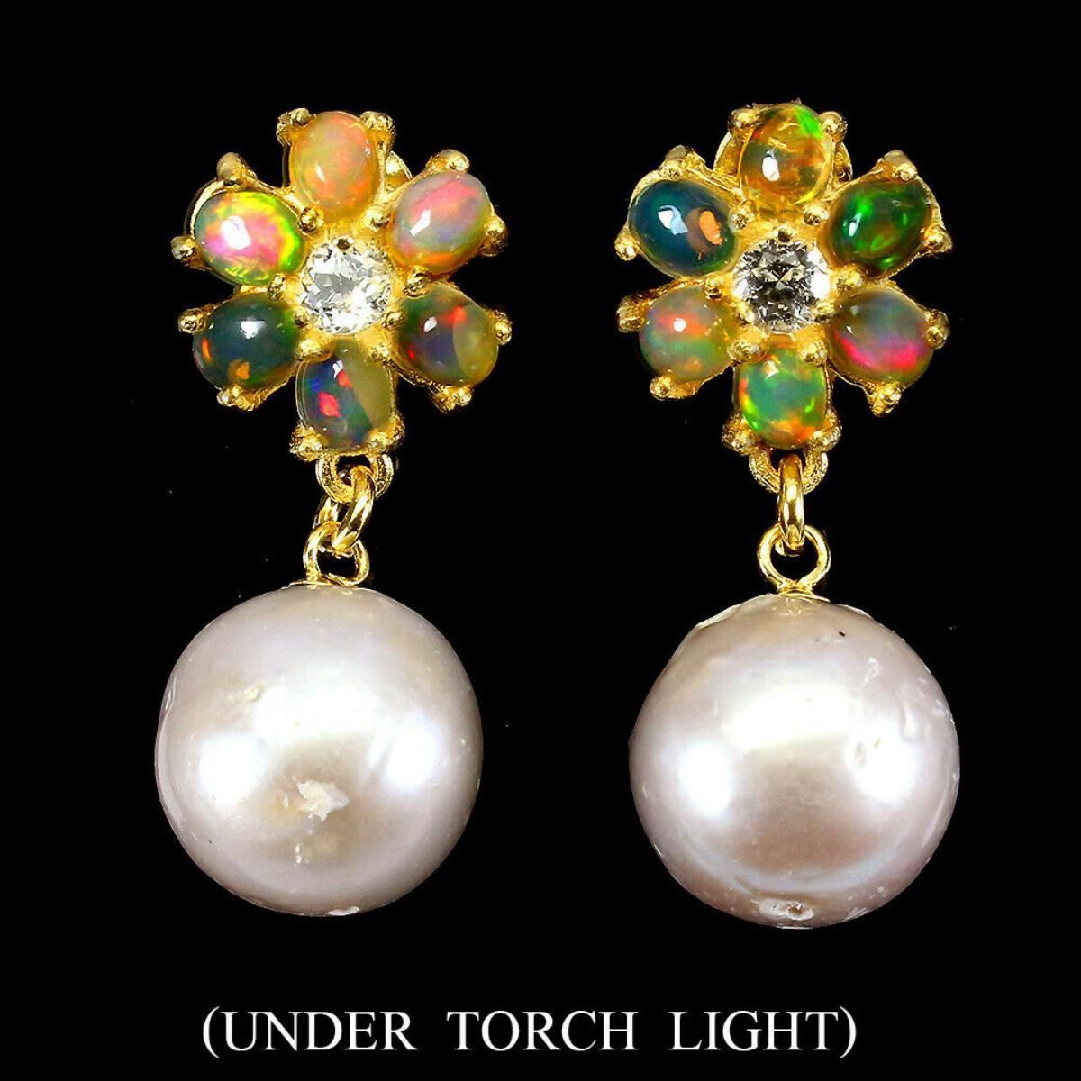 925 STERLING SILVER;PLATE-14K YELLOW GOLD;MAIN STONE-PEARL;OTHER GEMS-FIRE OPAL, WHITE TOPAZ;TOTAL WEIGHT-12.05 GRAM (TOTAL WEIGHT OF SILVER + STONE)DIMENSION-* STONE 4.0 TO 5.0 X 4.0 MM. * PEARL 14.0 MM. * FACE EARRINGS -38.0 X 14.0 MM.;MAIN STONE SHAPE-ROUND SPHERE;MAIN STONE COLOR-CREAMY GRAY;HARDNESS-2.5 - 4.5;